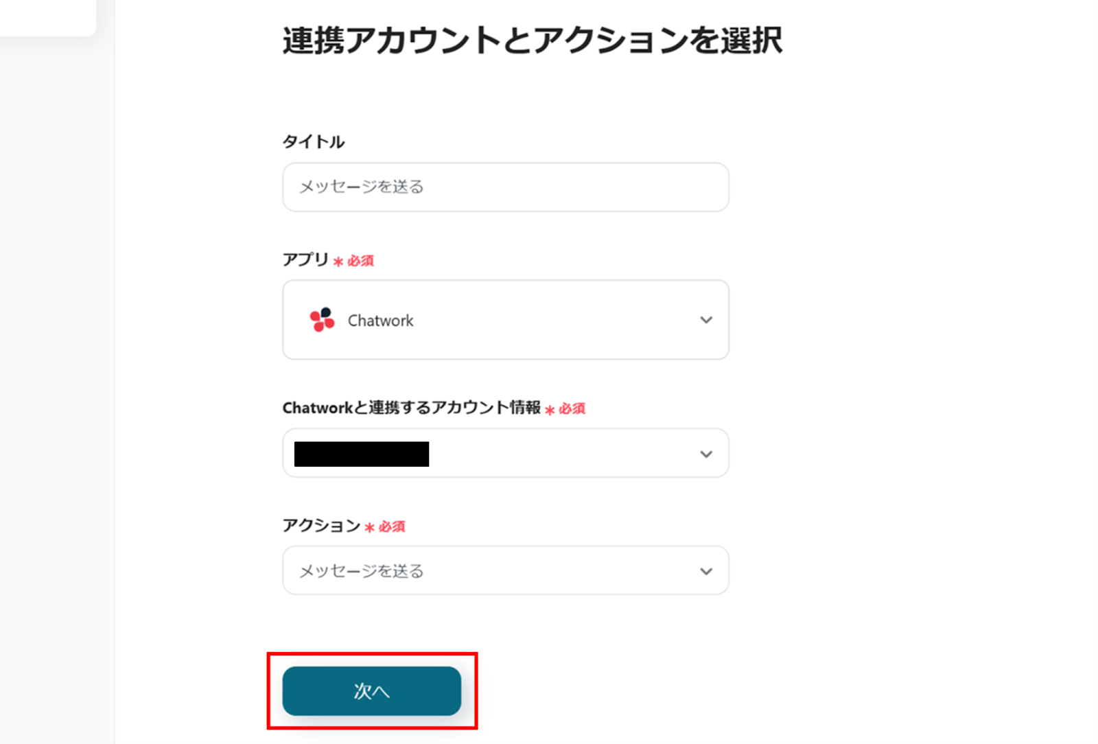 (2)Chatworkの「連携アカウントとアクションを選択」画面から、Chatworkと連携するアカウント情報に誤りがないかを確認し、アクションは「メッセージを送る」のままで「次へ」をクリックします。