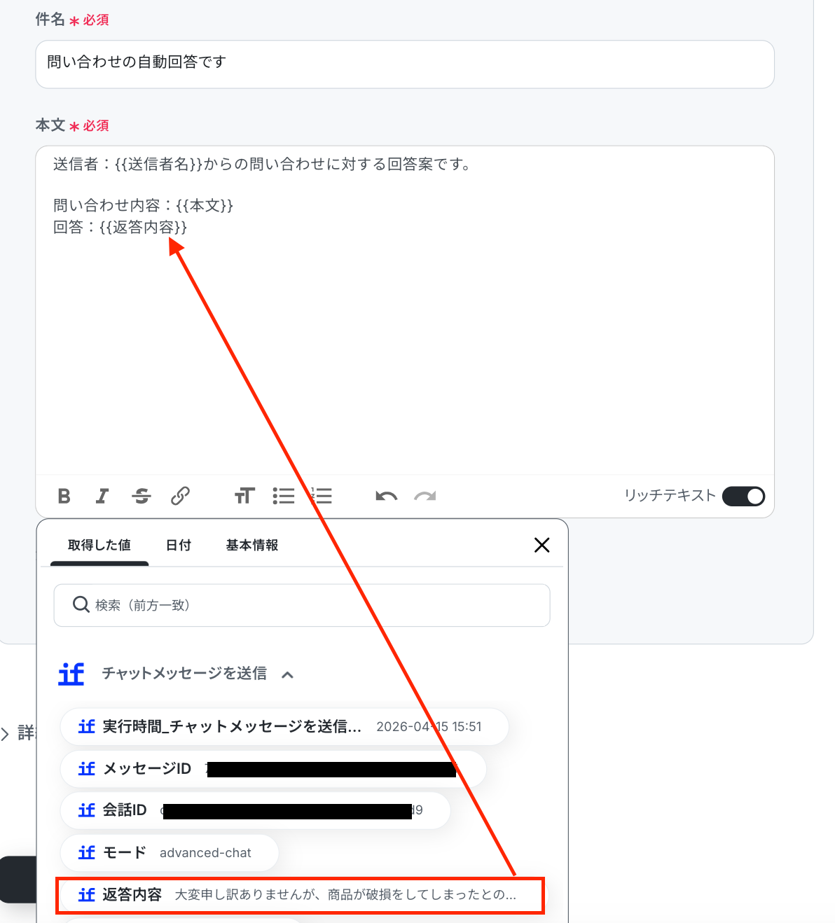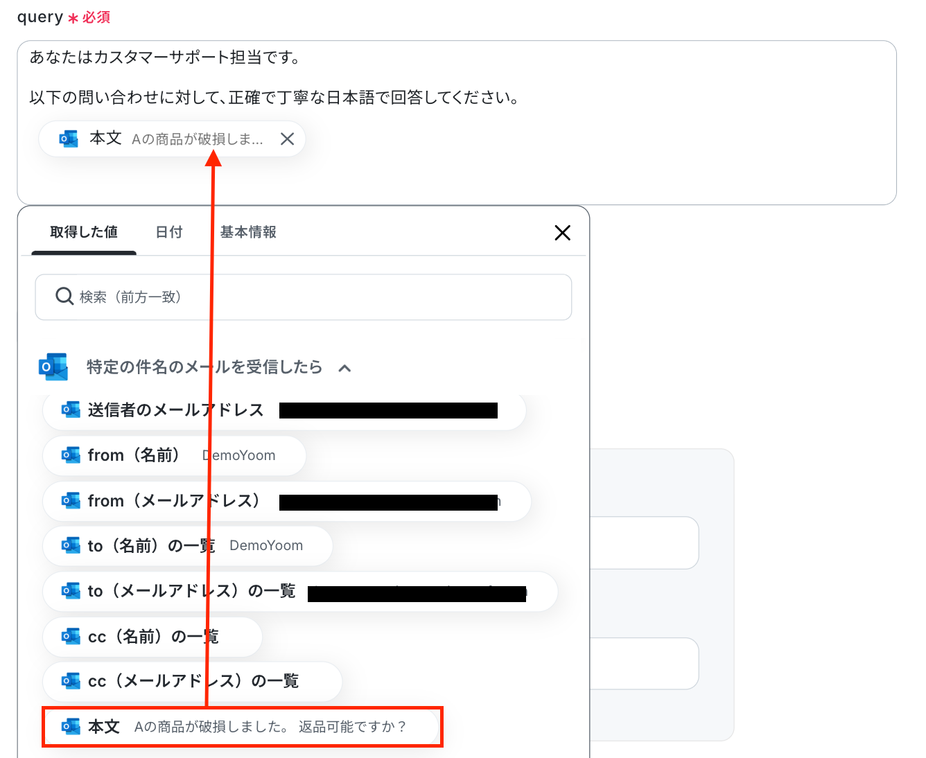 本文はOutlookのトリガー設定や、Difyのアクション設定で取得した値(アウトプット)を活用して作成しましょう。