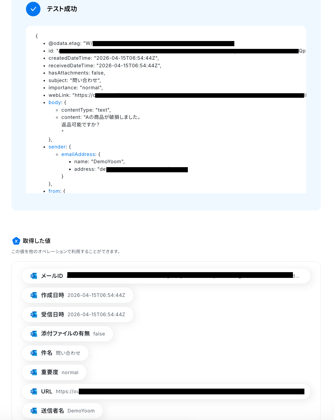 フローボットに戻り、テストします。 アウトプットにメール内容が反映したら保存しましょう。