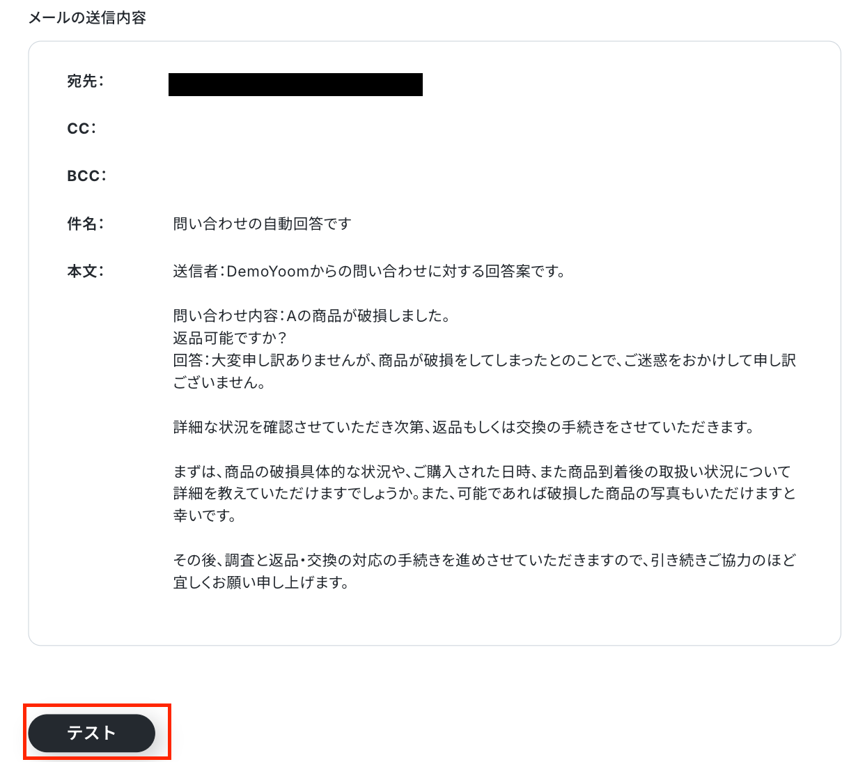 ここで送信内容に間違いがないか確認しましょう。 確認できたら、テストをします。