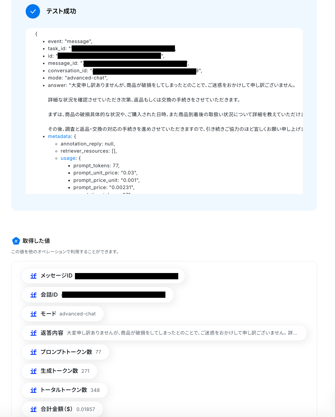 フォームトリガーの設定で、実際に起動のきっかけとしたいお問い合わせフォームを任意で設定してください。 Difyの「チャットメッセージを送信」アクションでは、AIへの指示(query)やユーザー情報(user)を任意に設定してください。 Slackの「チャンネルにメッセージを送信」アクションでは、メッセージを投稿するチャンネルIDや、通知するメッセージの内容を任意に設定してください。 ■注意事項