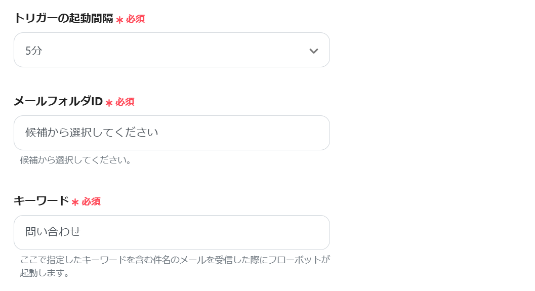 トリガーの起動間隔 :5分、10分、15分、30分、60分の間隔から選べます。※プランによって起動間隔の選択内容が変わります。 キーワード :問い合わせ、としました。