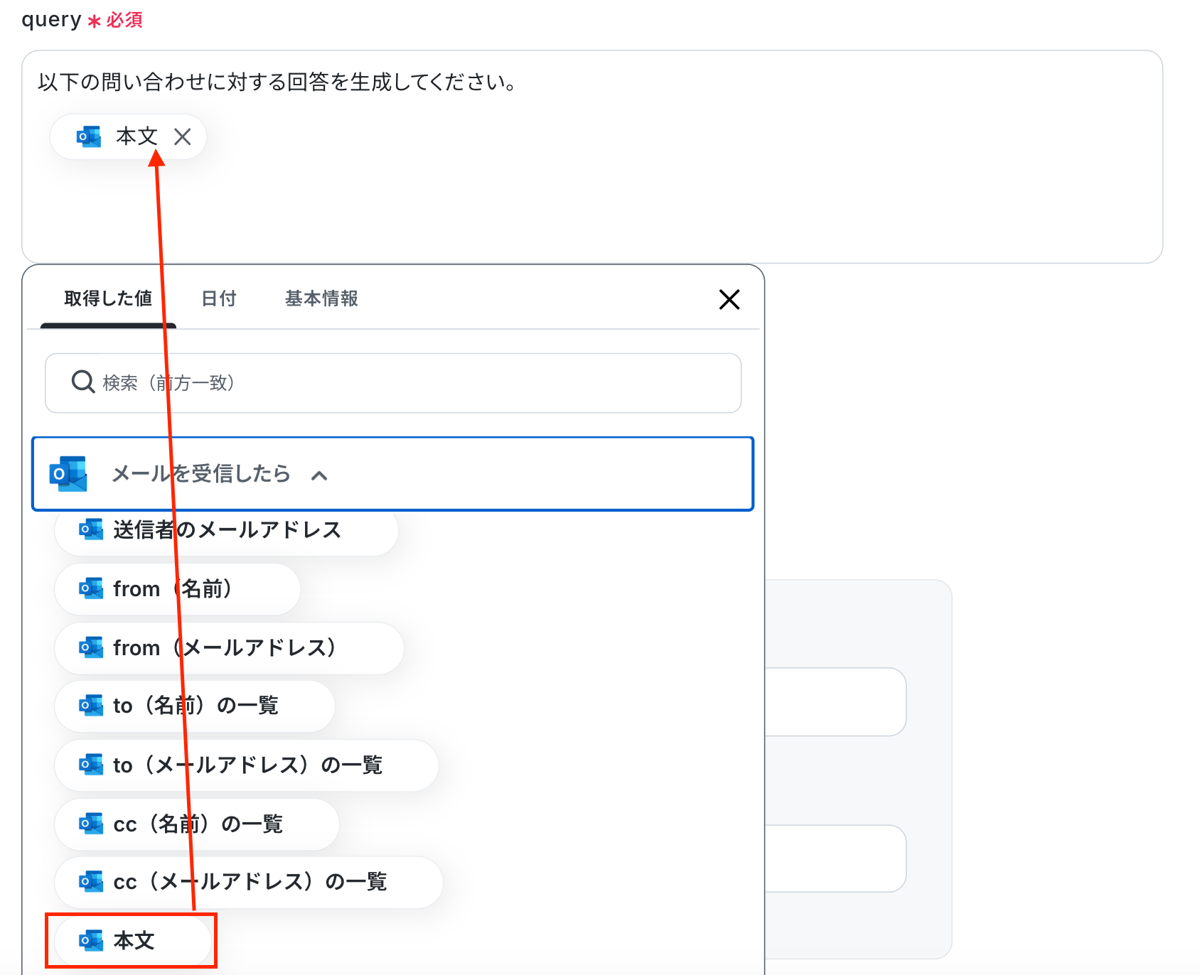 「query」は、欄をクリックし表示された候補からお問い合わせ内容である「本文」を選択してください。