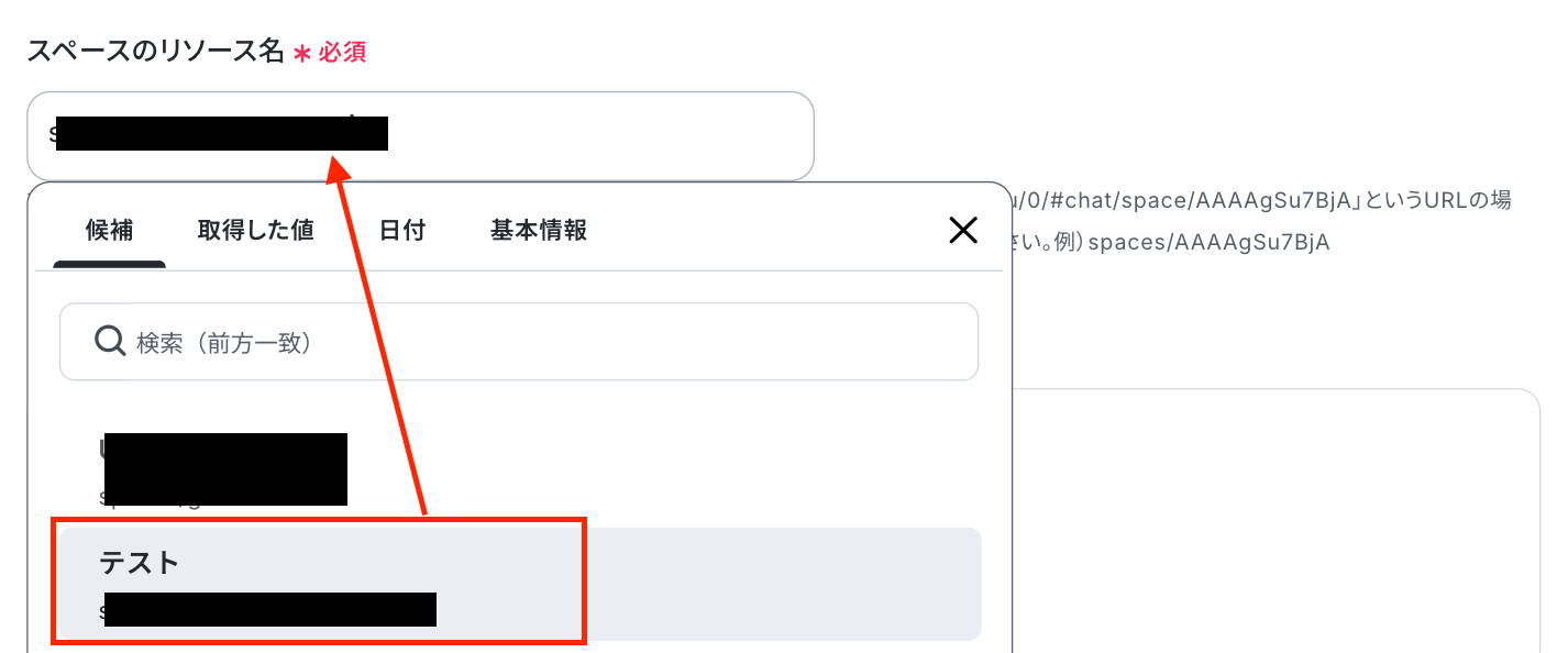 「スペースのリソース名」は、候補からスペースを選択するか、注釈を参照してGoogle ChatのURLからリソース名を引用してください。