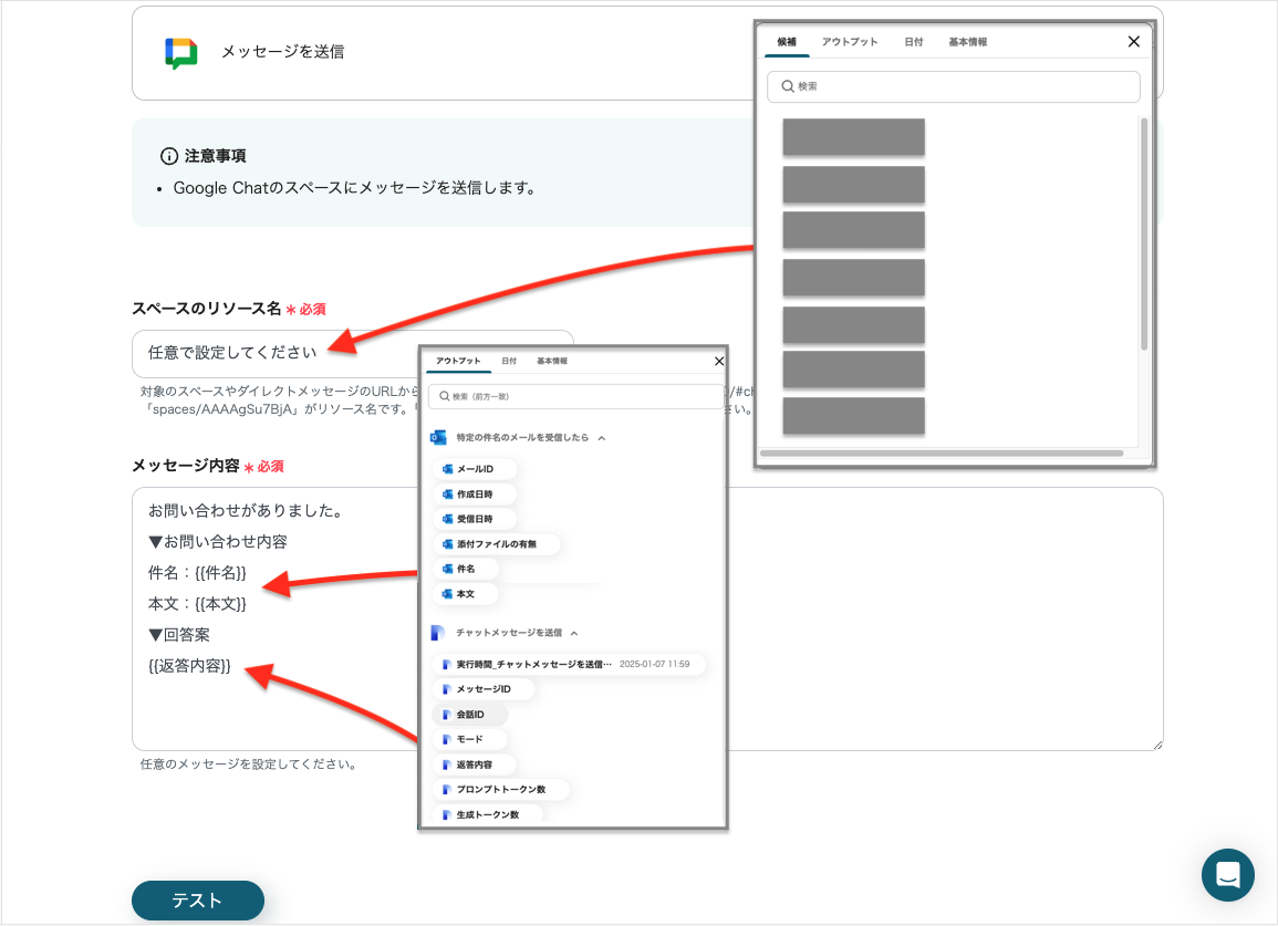 設定が完了したら「テスト」をクリックしてGoogle Chatにメッセージが送信されるか確認しましょう。