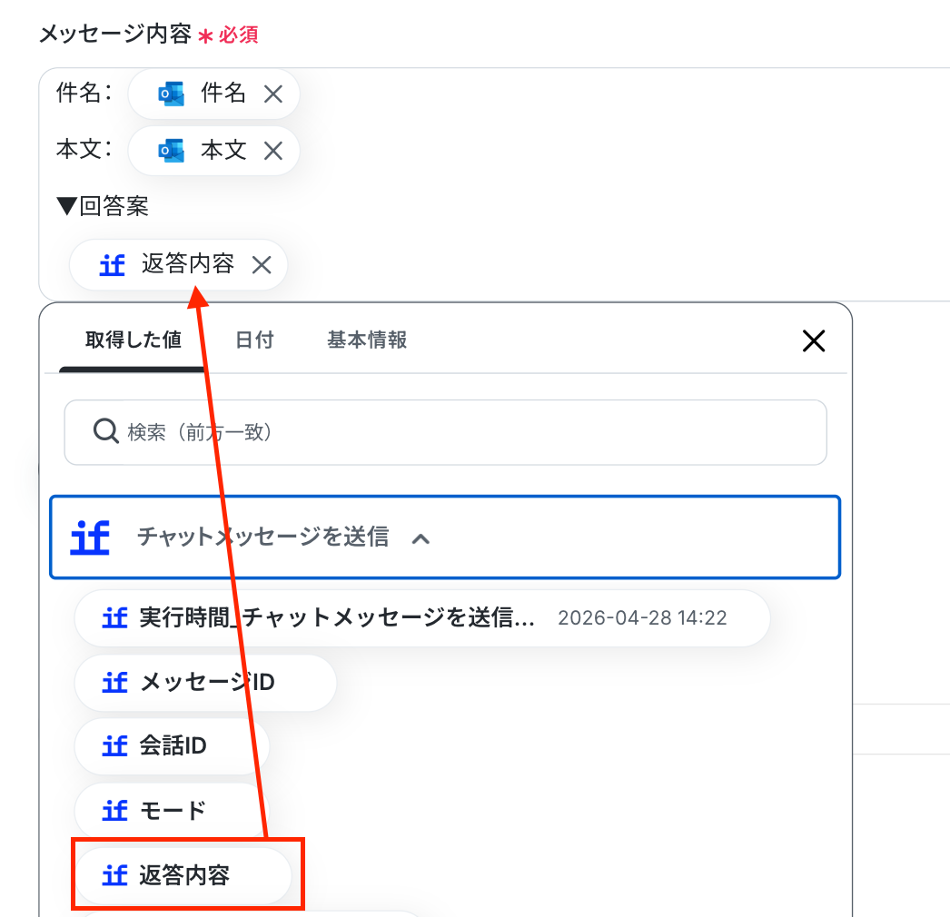 「メッセージ内容」は、任意で編集可能です。今回はメールの件名と本文、Difyの返答内容を含むメッセージを設定しました。