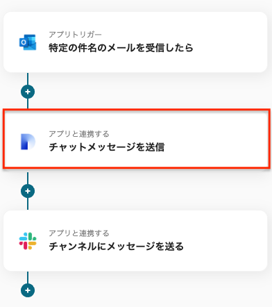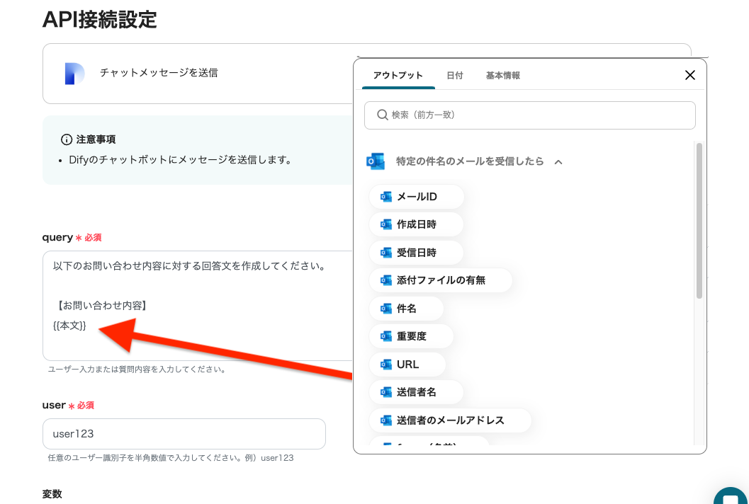 「メッセージ内容」は、任意で編集可能です。今回は問い合わせメールの件名と本文、Difyの返答内容を含むメッセージを設定しました。
