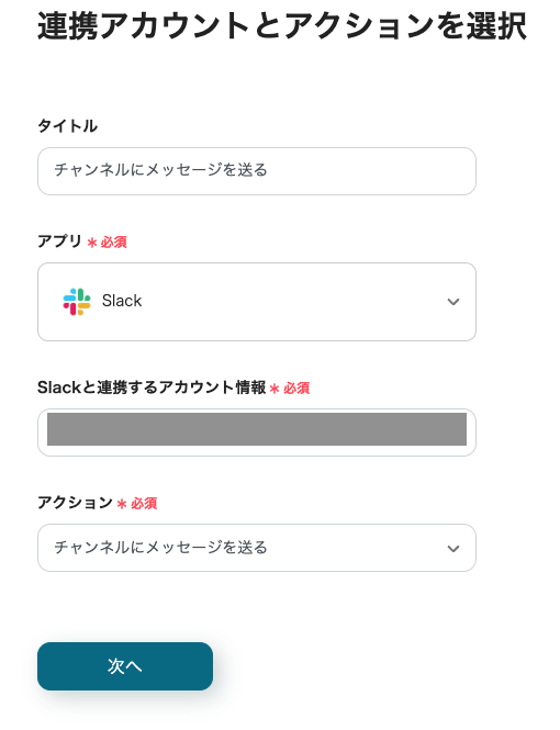 • Slackの「チャンネルにメッセージを送る」アクションでは、通知を送信するチャンネルや、通知するメッセージの本文を任意で設定してください。