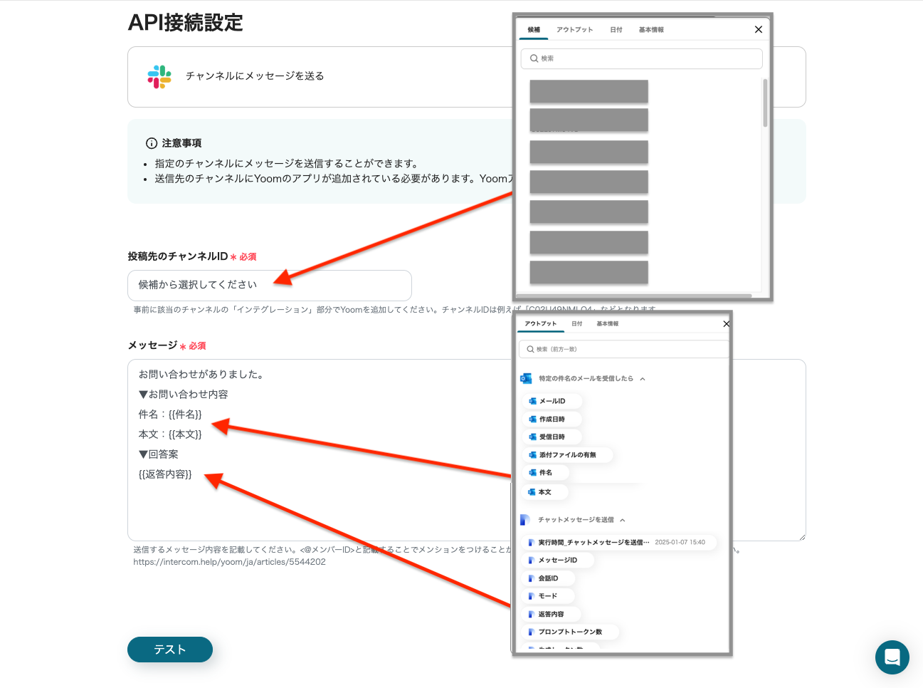 設定が終わったら「テスト」をクリックして、Slackに設定したメッセージが送信されるか確認しましょう。