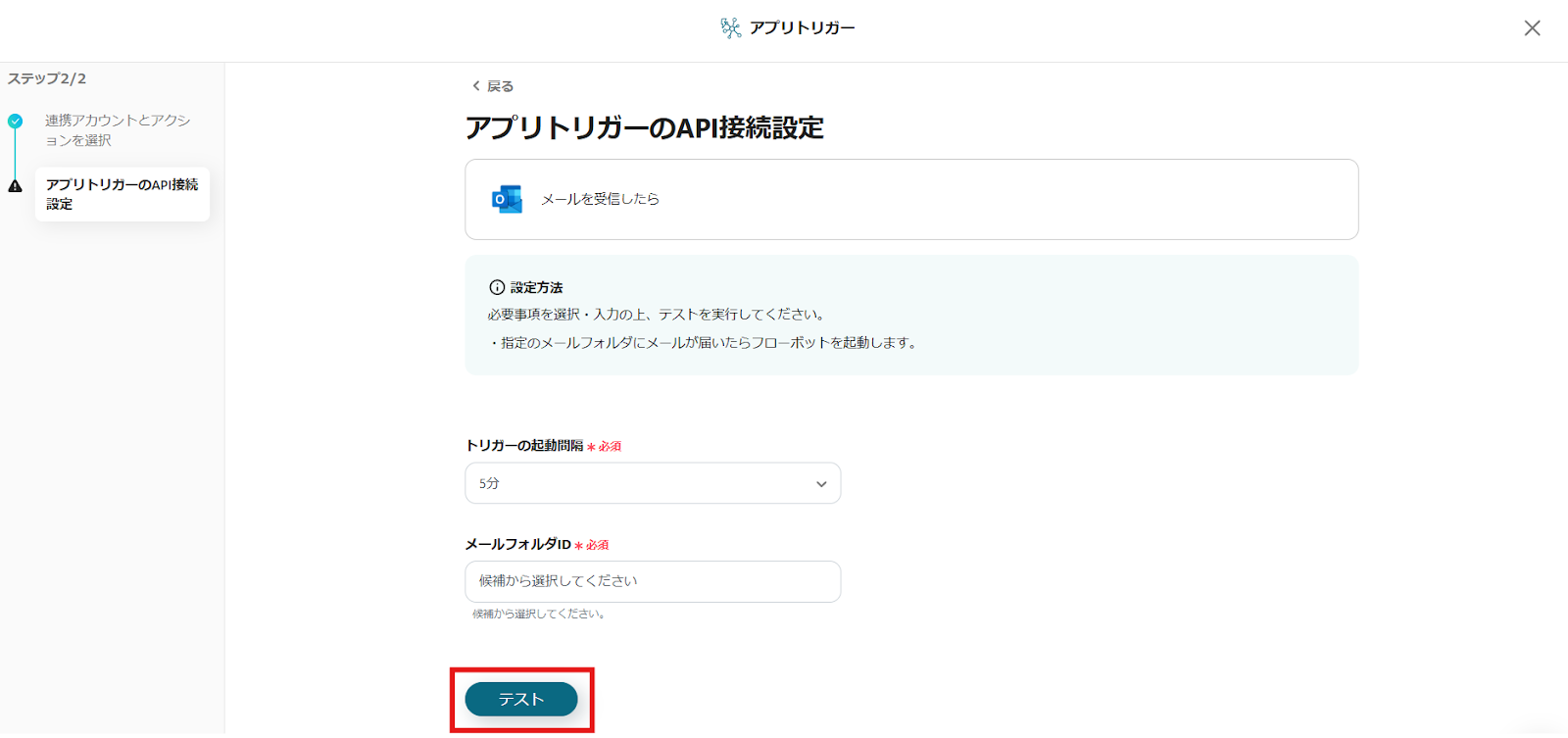 設定後、トリガーとなるアクション(今回はデータファイルが添付されているメールの送受信)を行って、[テスト]を押してください。