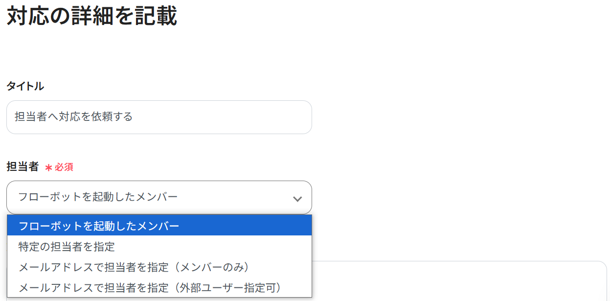 対応の詳細を設定していきます。まず対応を依頼する担当者をプルダウンから選択してください。
