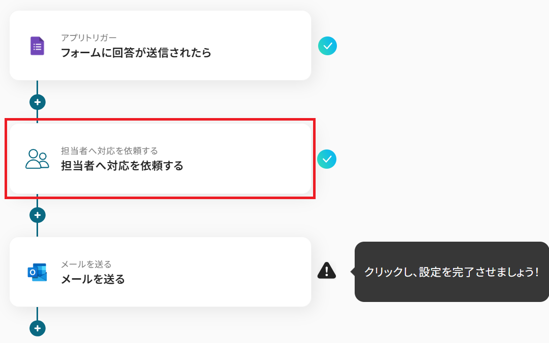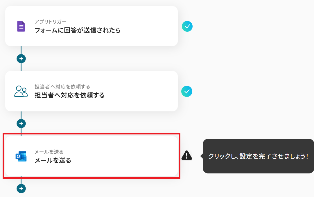 「Googleフォームで回答があったら、担当者にメールチェックを依頼して、Outlookでメールを送信する」ワークフローを利用すると、フォーム回答後の対応がスムーズに進みます。