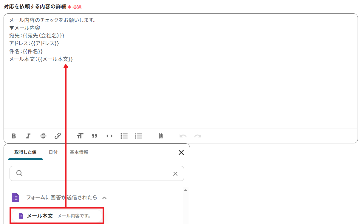 次に、対応を依頼する内容の詳細を設定しましょう。今回はテンプレートを使っているので予め入力されていますが、文面や項目を任意で編集・追加することも可能です。
