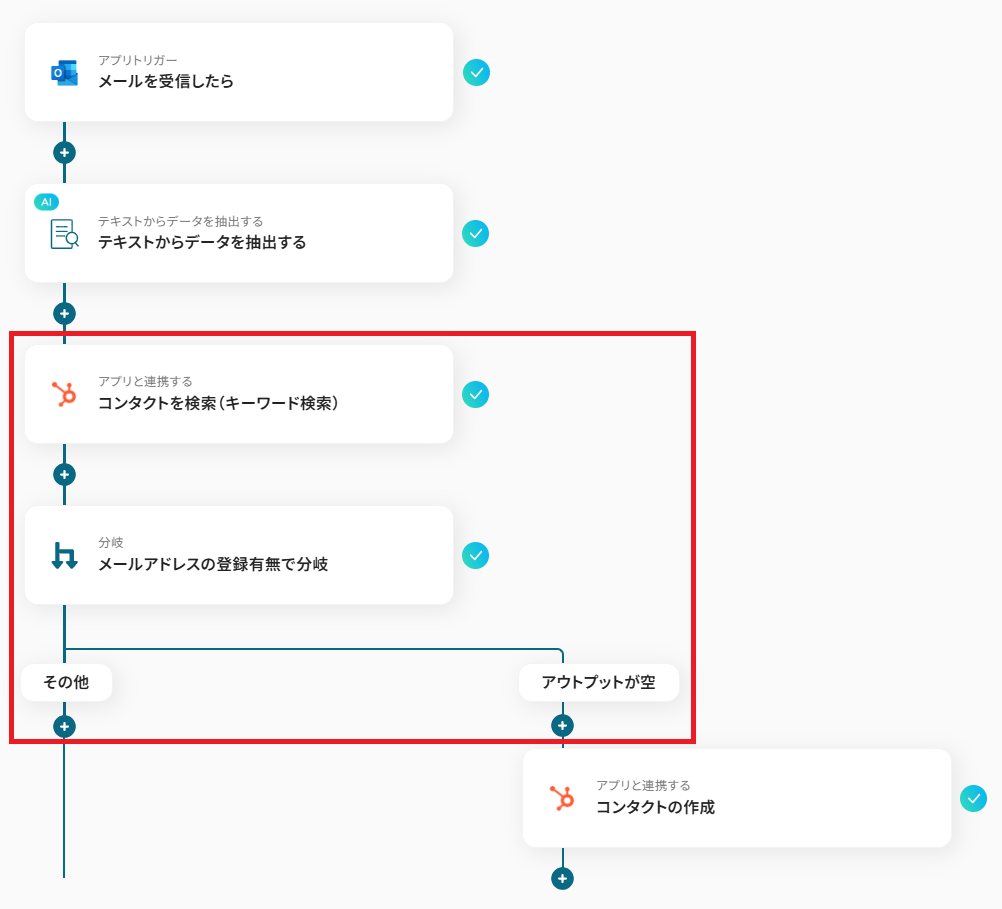 分岐機能を利用すれば、HubSpotに登録されていない相手だけをコンタクトに追加できます。