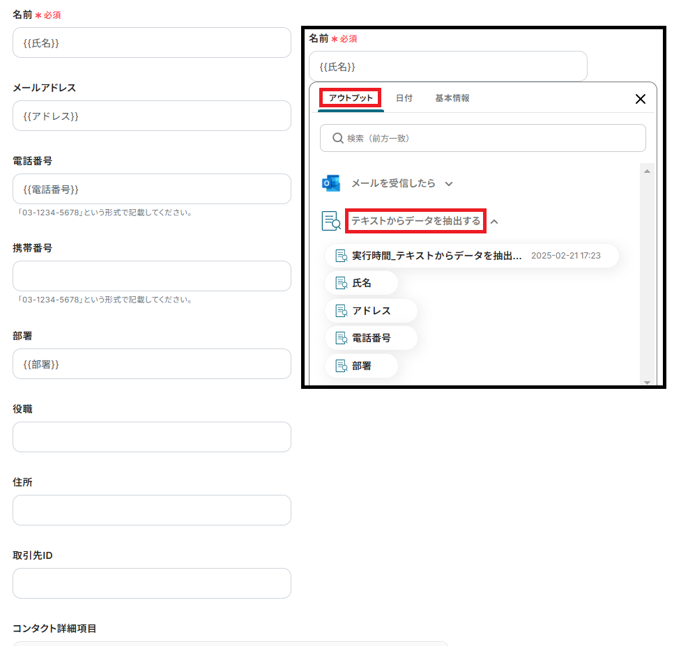 ※抽出したテキストを反映させる場合は、枠をクリックして表示されるアウトプットの「テキストからデータを抽出する」から設定します。(値は二重括弧で表示されます)