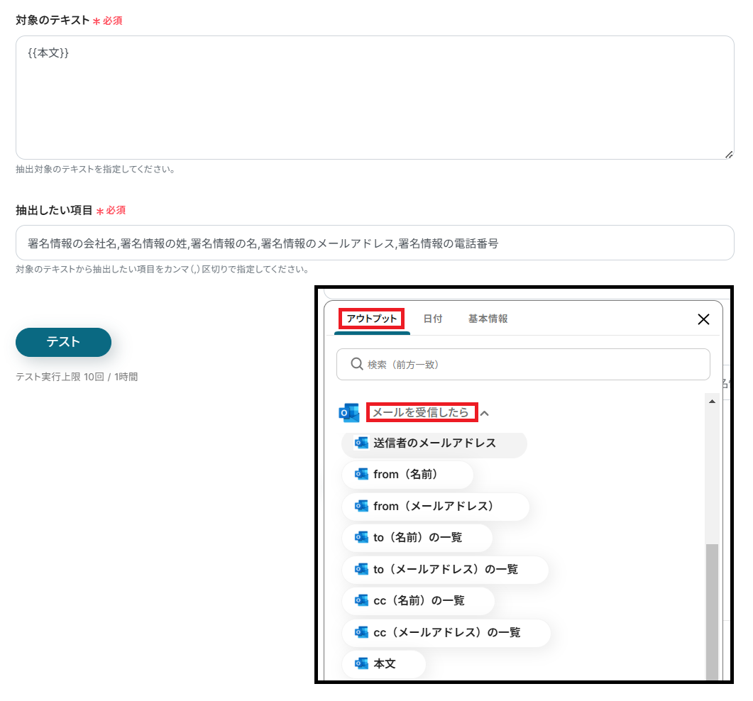 ※対象のテキストには、枠をクリックして表示されるアウトプットの「メールを受信したら」から「本文」を設定します。(値は二重括弧で表示されます)