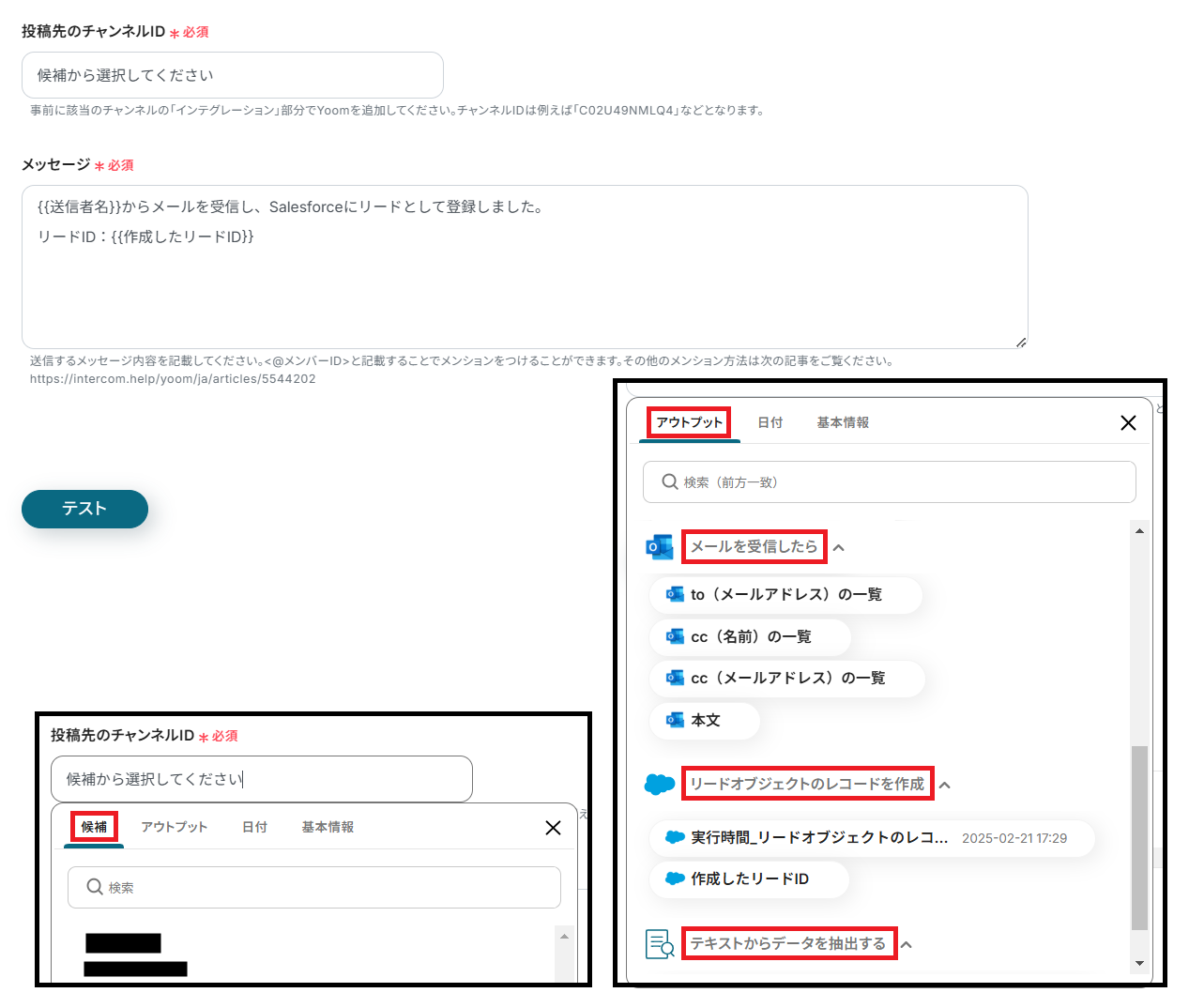 ※投稿先のチャンネルIDは、枠をクリックして表示される「候補」から設定できます。