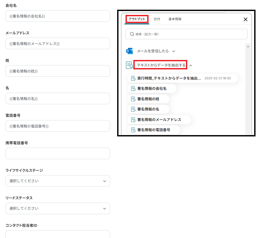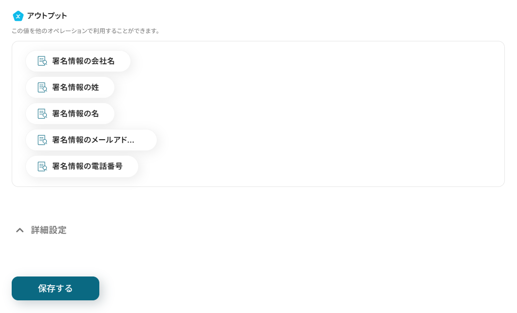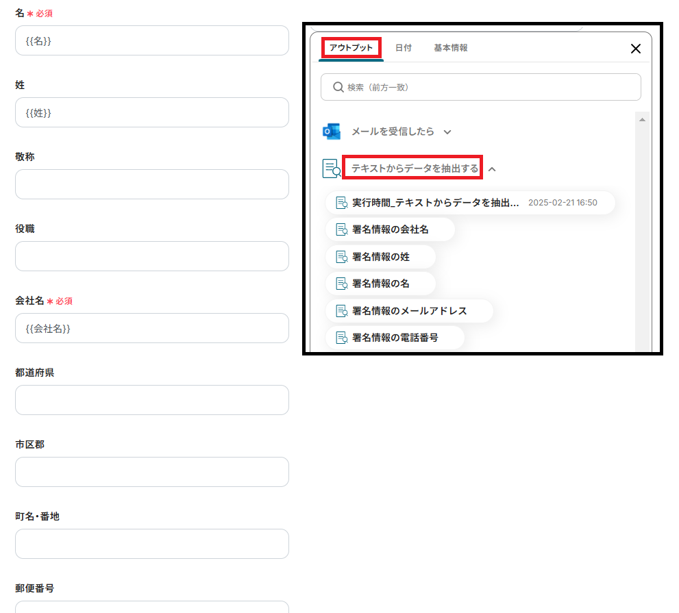 ※抽出した署名情報を反映させる場合は、枠をクリックして表示されるアウトプットの「テキストからデータを抽出する」から設定します。(値は二重括弧で表示されます)