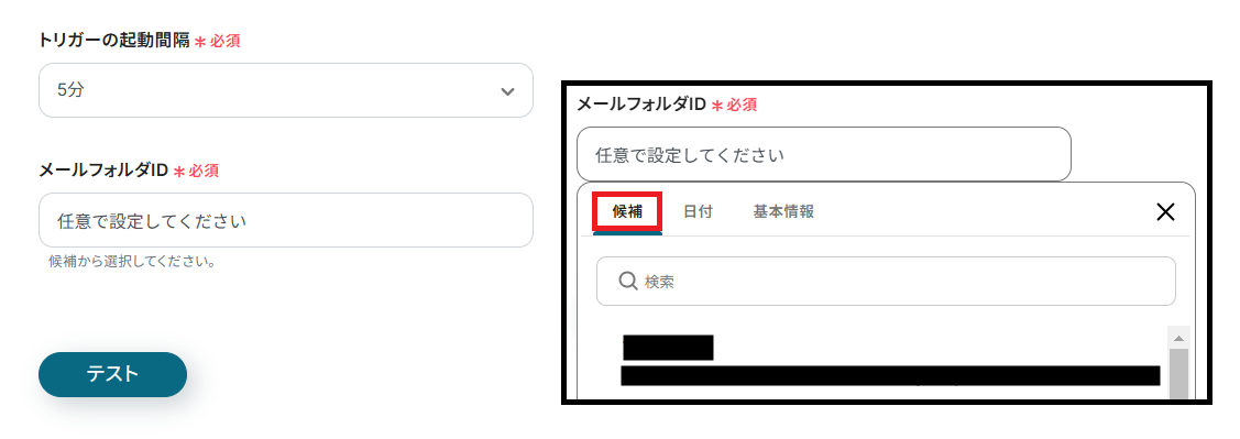 ※メールフォルダIDは、枠をクリックして表示される「候補」から設定できます。