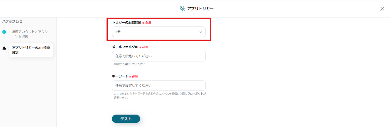 トリガーは5分、10分、15分、30分、60分の間隔で起動間隔を選択できます。