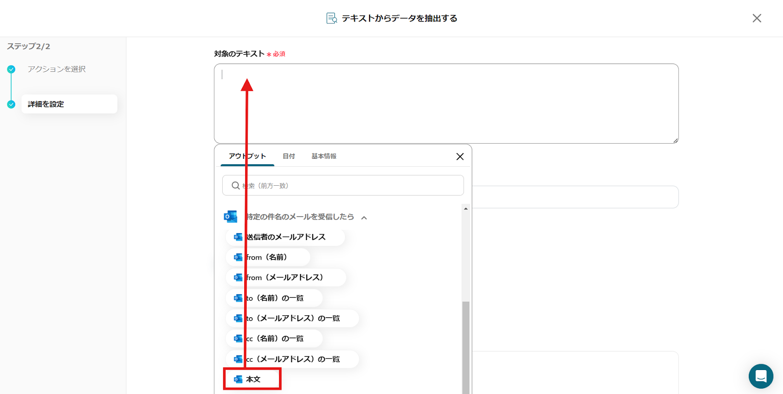 まずはメールのどのような部分からデータを抽出するか設定します。