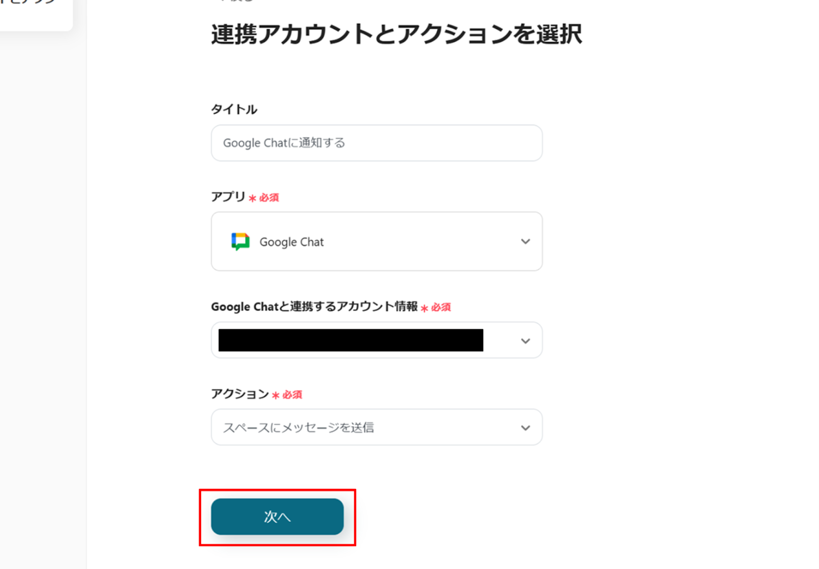(2)Google Chatの「連携アカウントとアクションを選択」画面から、Google Chatと連携するアカウント情報に誤りがないかを確認し、アクションは「Google Chatに通知する」のままで「次へ」をクリックします。
