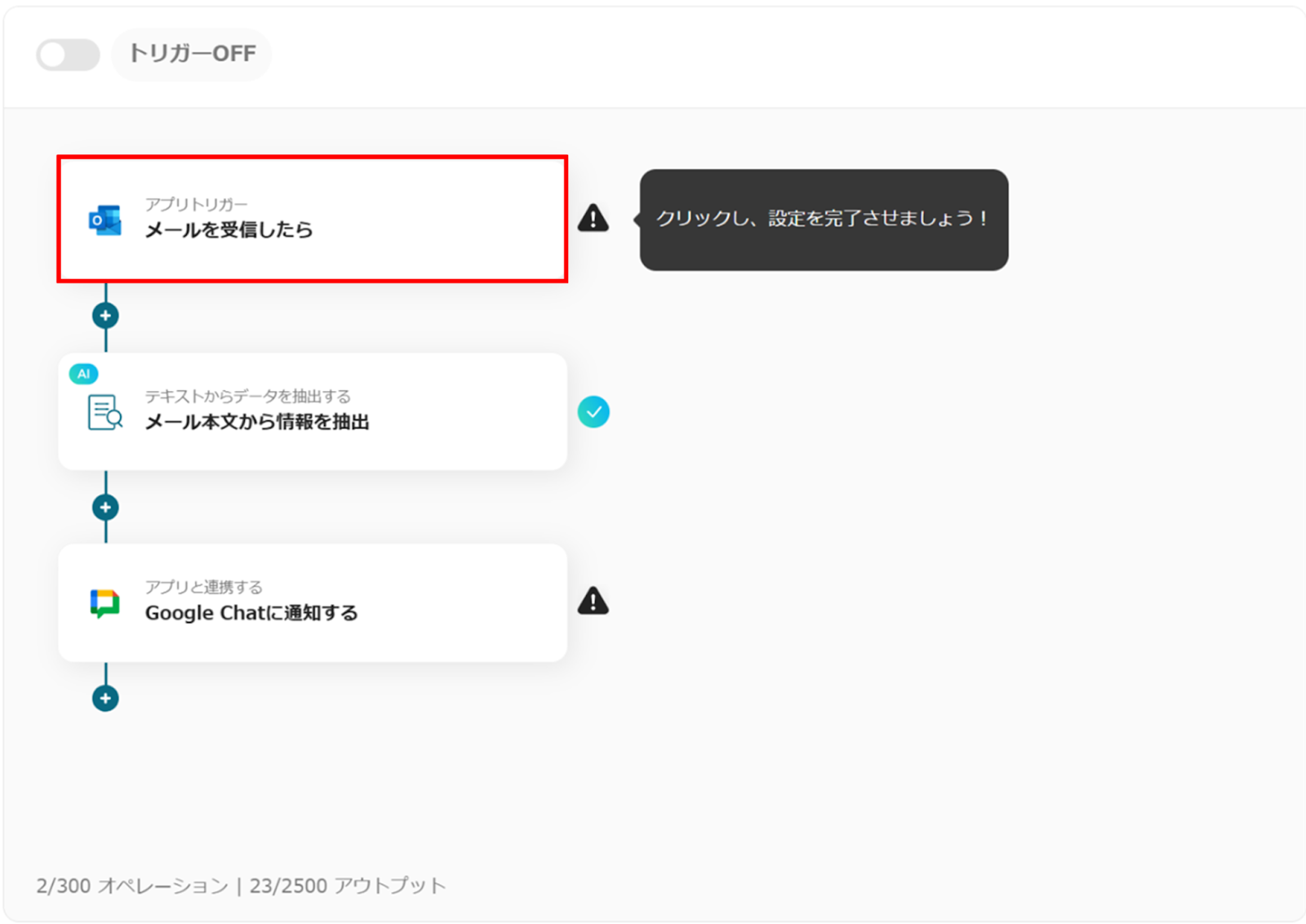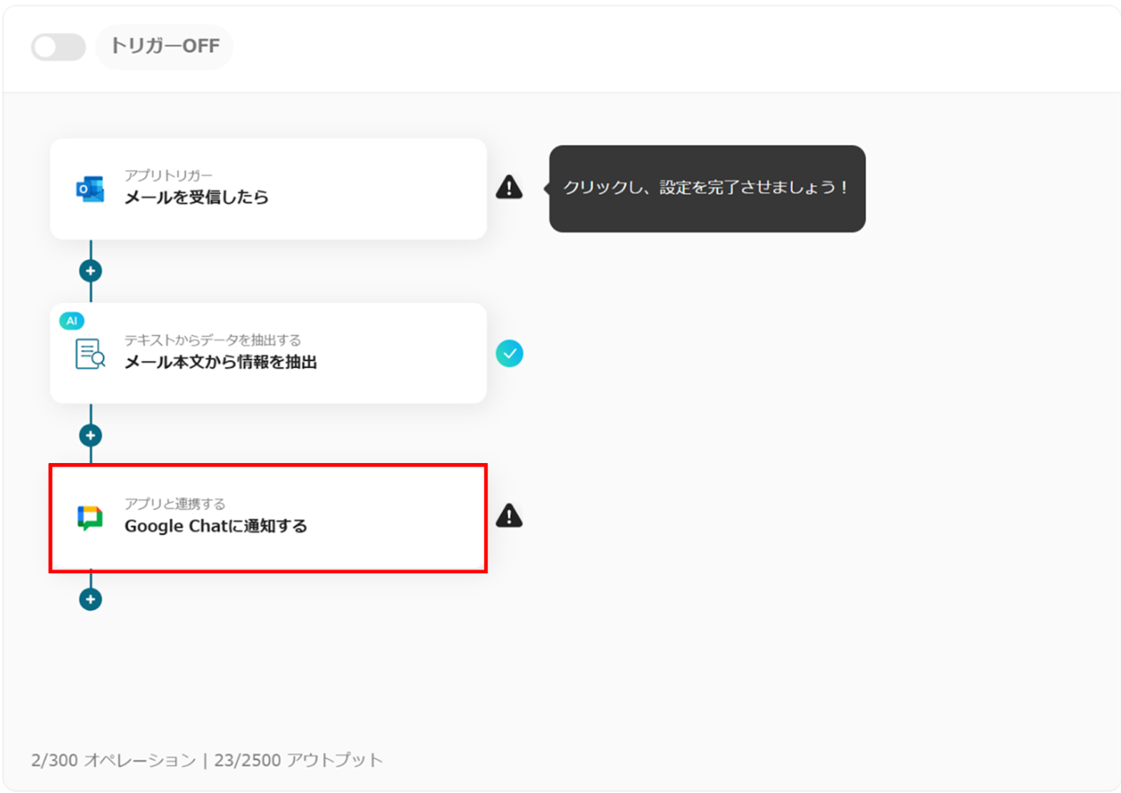 これで、「Outlookメールに届いた情報をAIで抽出し、Google Chatに通知する」フローボットの完成です。