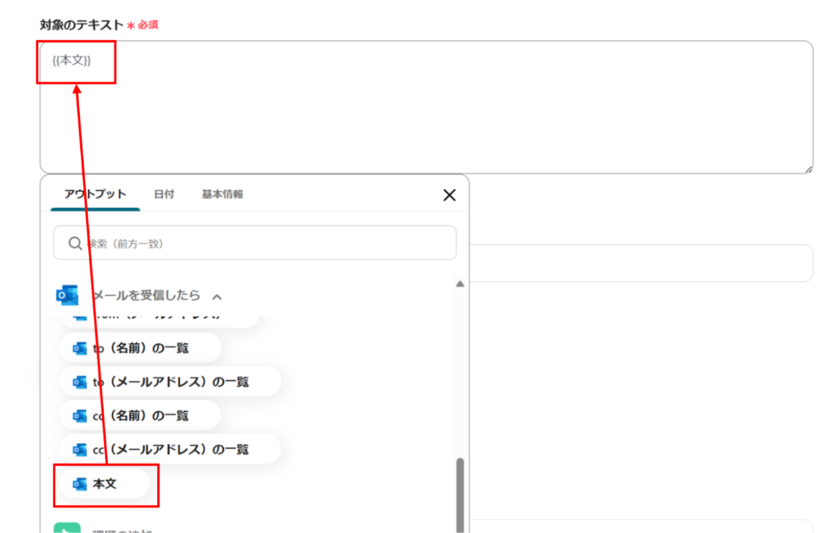 アウトプットから選択することでOutlookの情報を引用することができます。