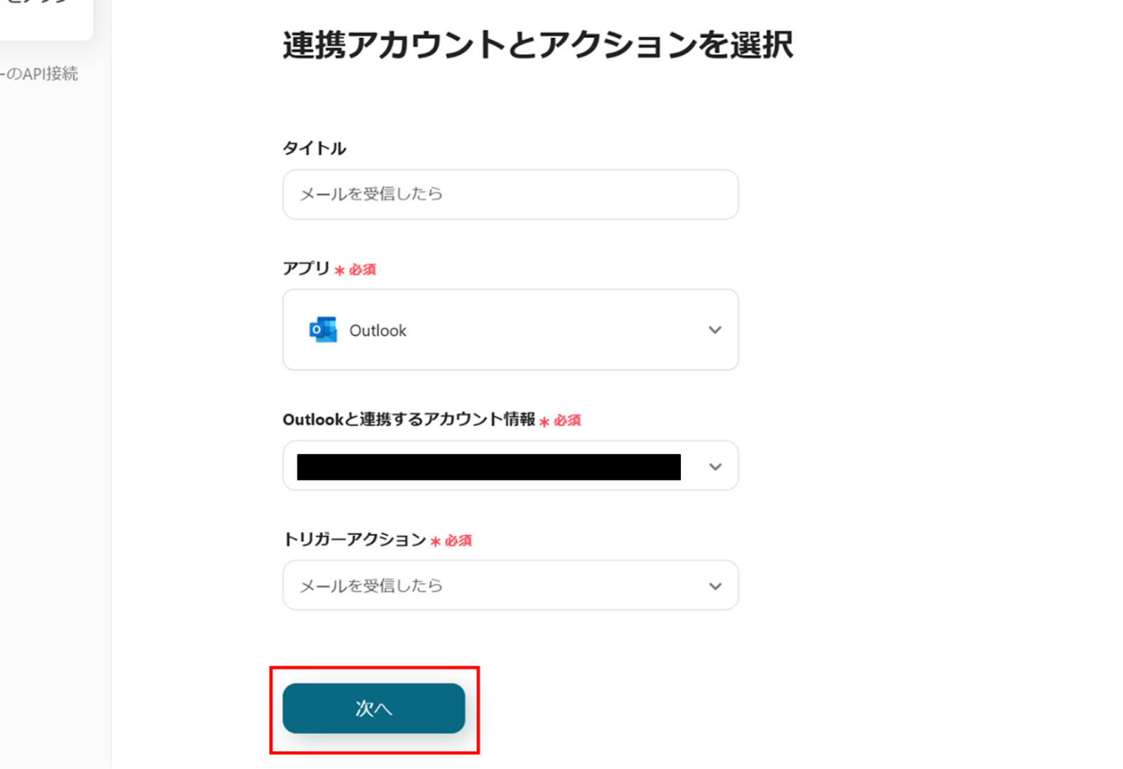 (2)Outlookの「連携アカウントとアクションを選択」画面から、Outlookと連携するアカウント情報に誤りがないかを確認し、トリガーアクションは「メールを受信したら」のままで「次へ」をクリックします。