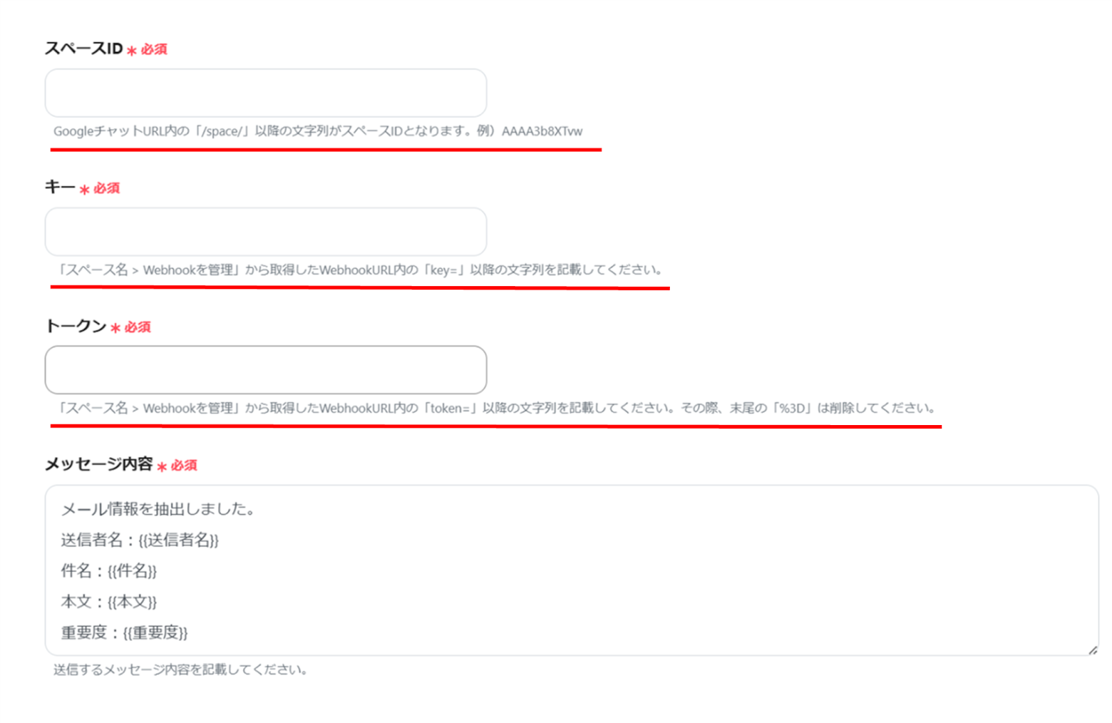 (3)「API接続設定」画面から、赤線を確認の上、スペースID、キー、トークン、メッセージ内容を入力します。