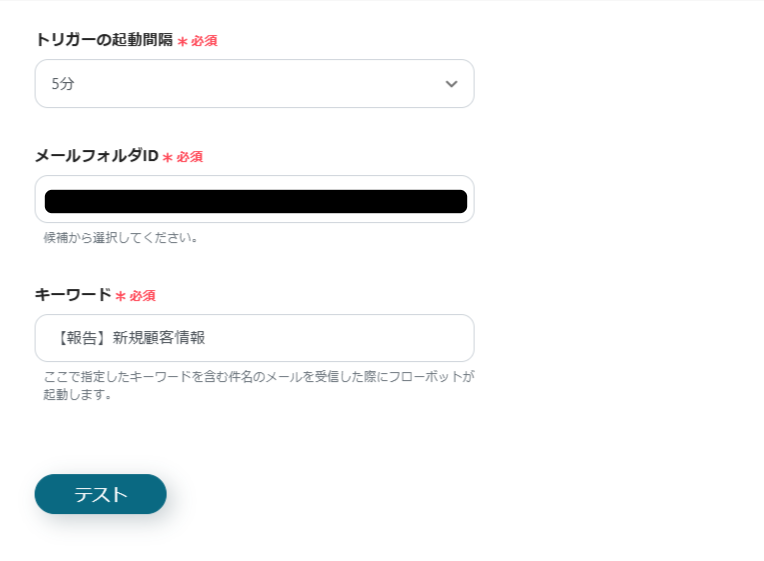 すべて入力したら、指定したキーワードを含んだメールを仮で送信してから「テスト」をクリックしてください。
