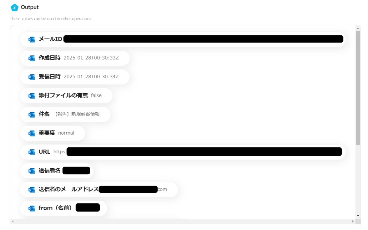 指定した件名のキーワードを含めて、メールの情報がアウトプットで取得できました。