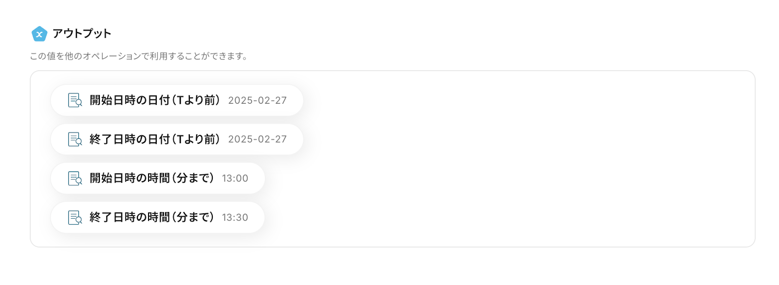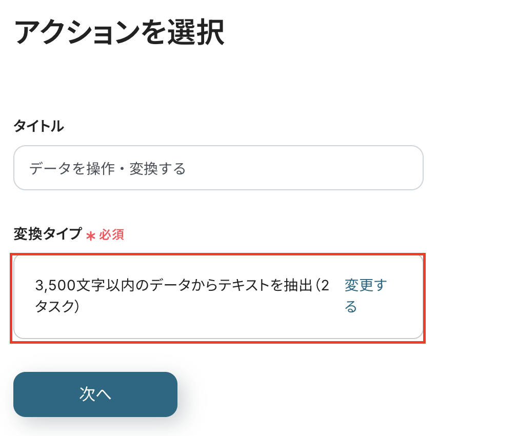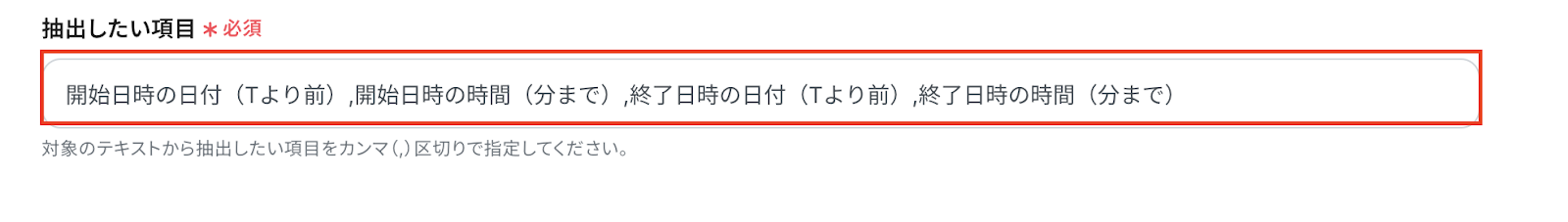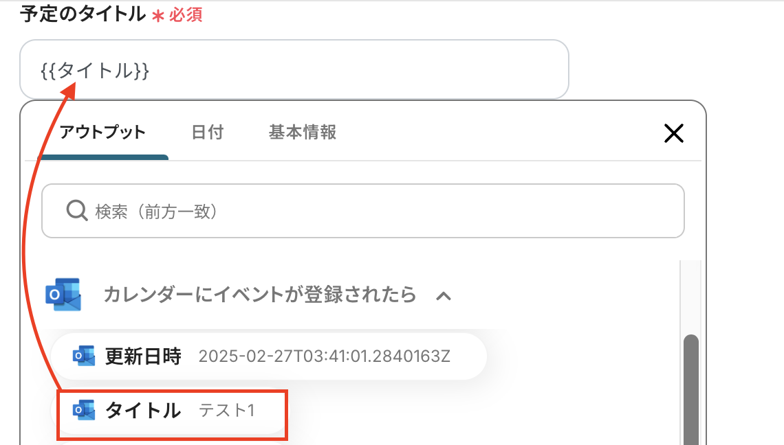 ※アウトプット(取得した値)を使用せず、固定のテキストを入れてしまうと、毎回それについて抽出されてしまうため、アウトプット(取得した値)から必ず選択してください。