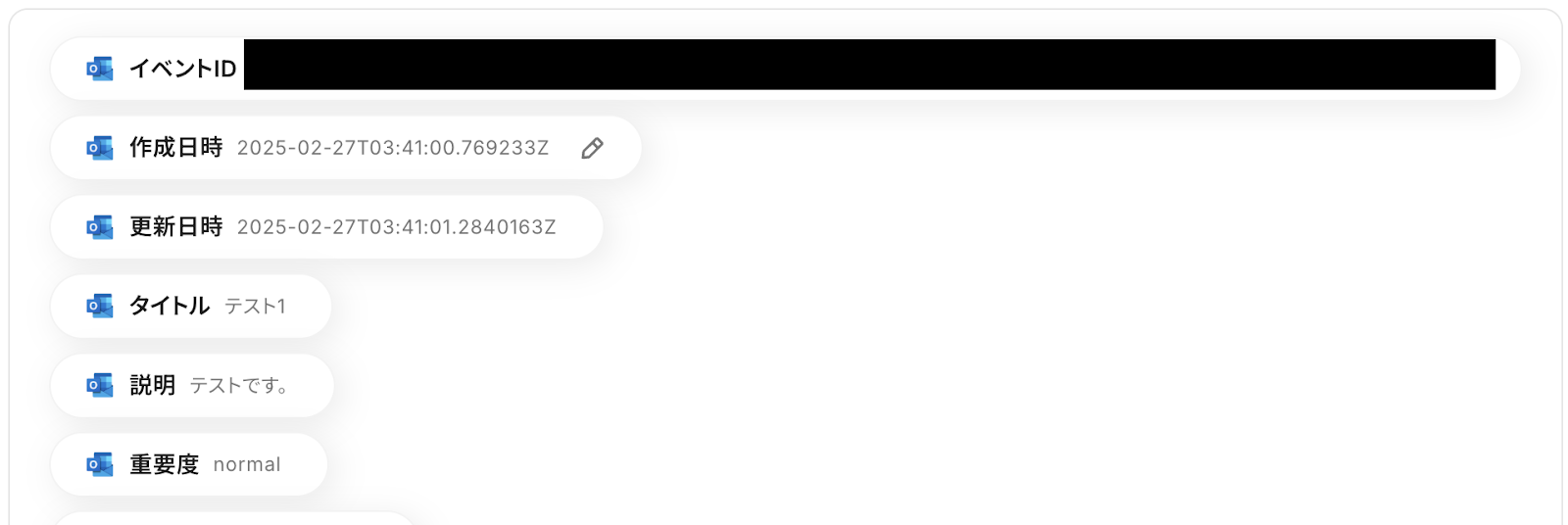 Outlookの予定表情報をアウトプット(取得した値)として情報が取得できたら成功です。