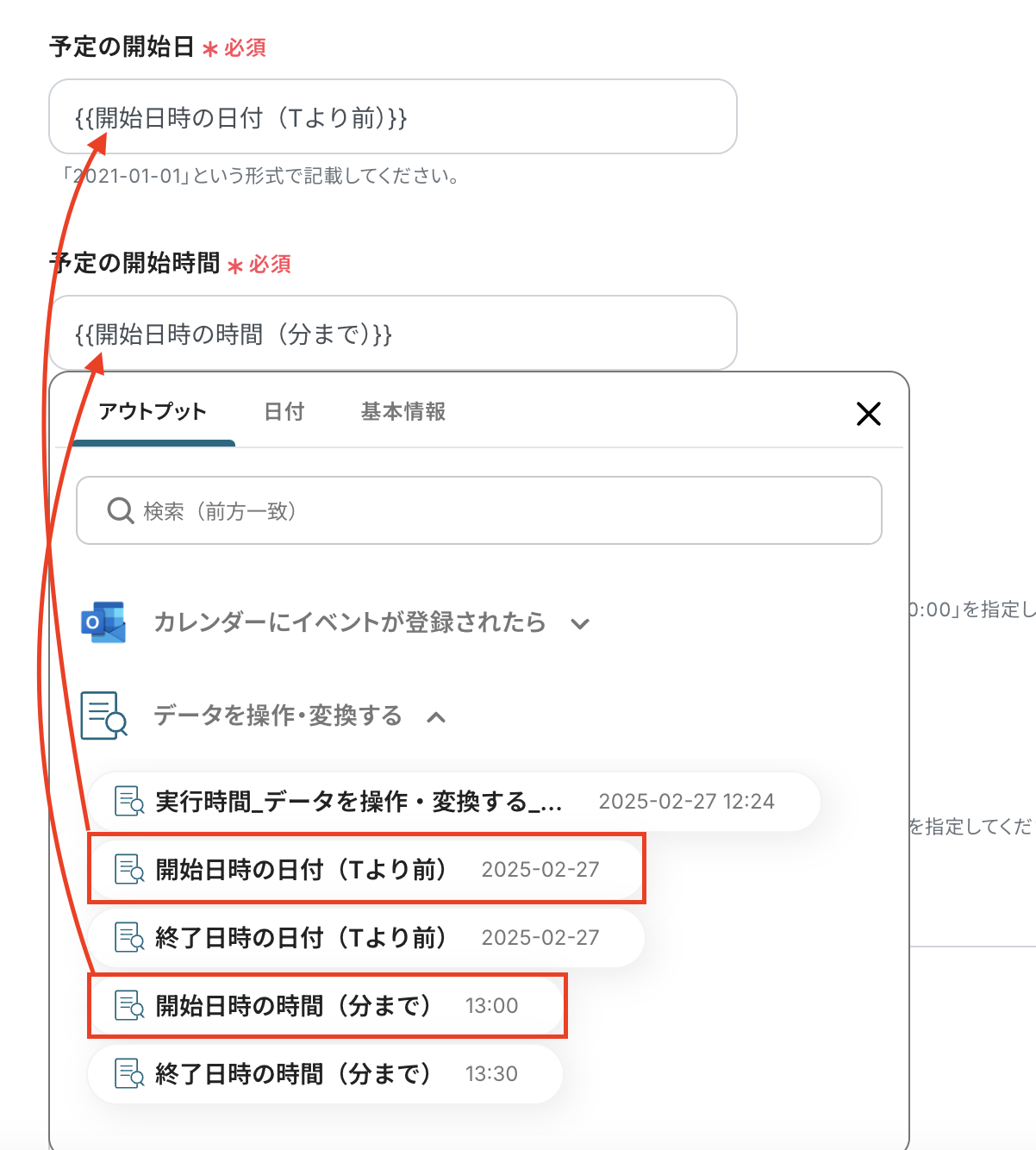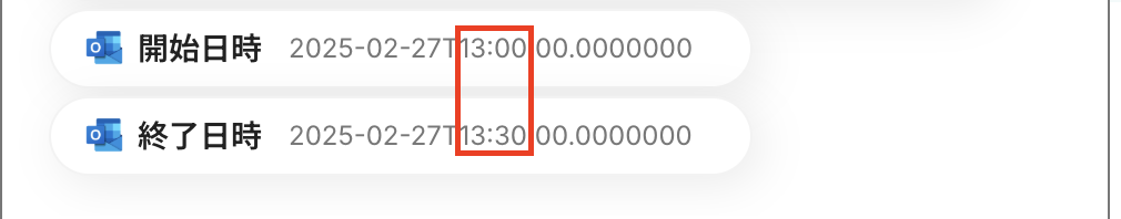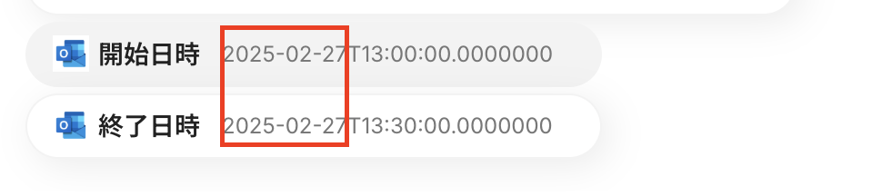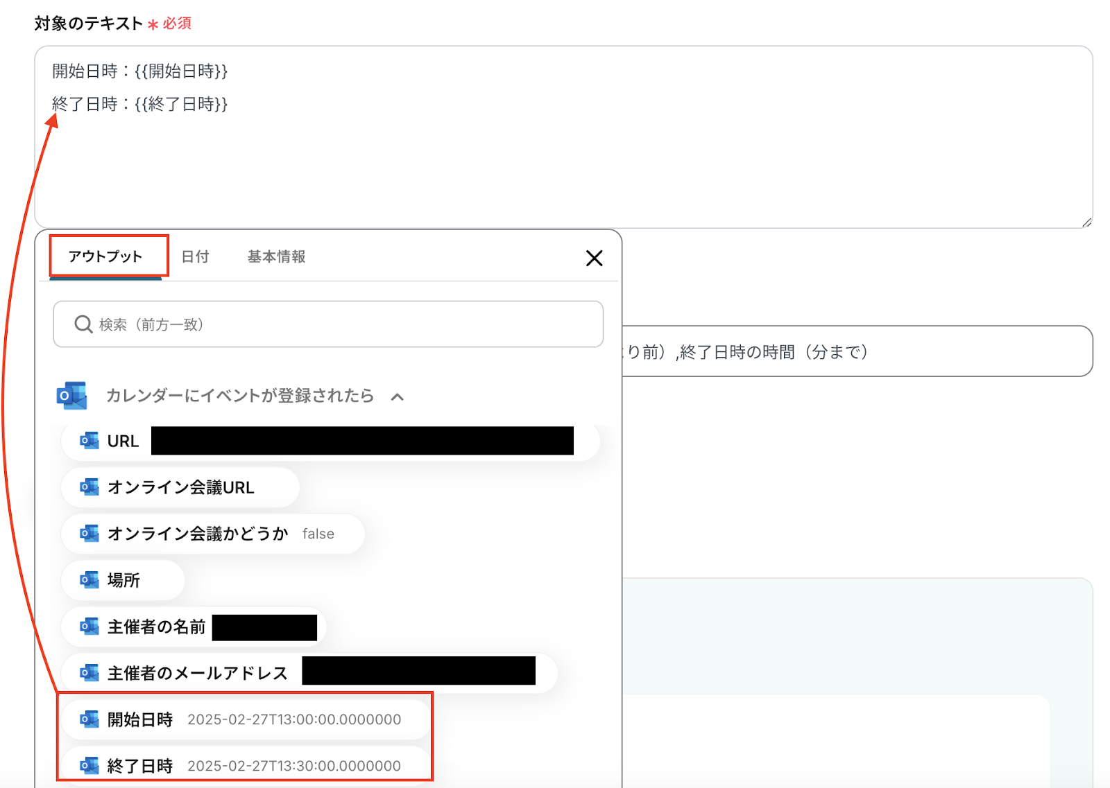 対象のテキストには、添付画像のように開始日時と終了日時をOutlookのアウトプットから選択します。