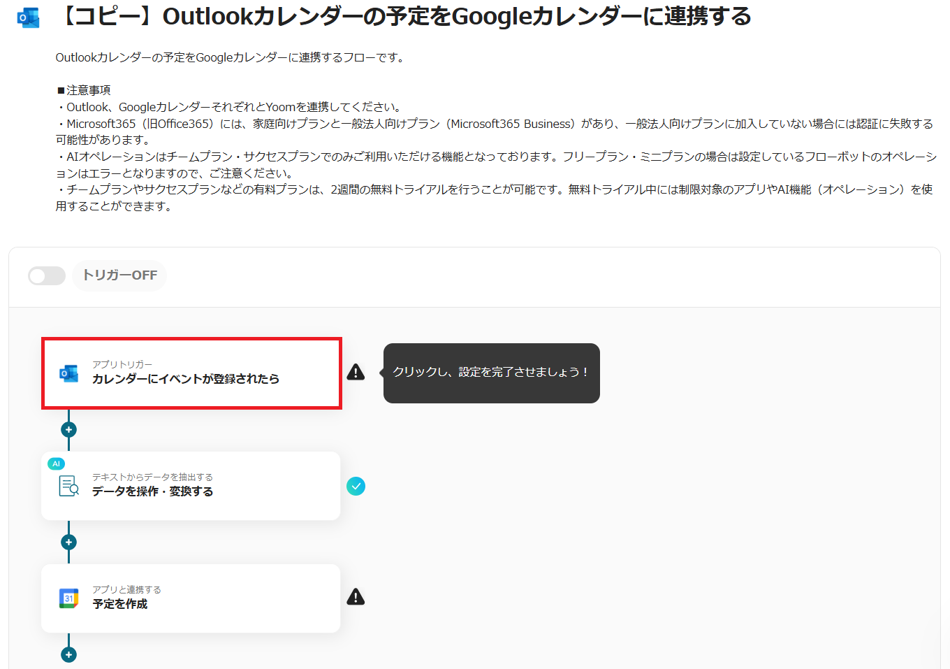 それでは、実際にOutlookとGoogleカレンダーを連携したフローを作成してみましょう!