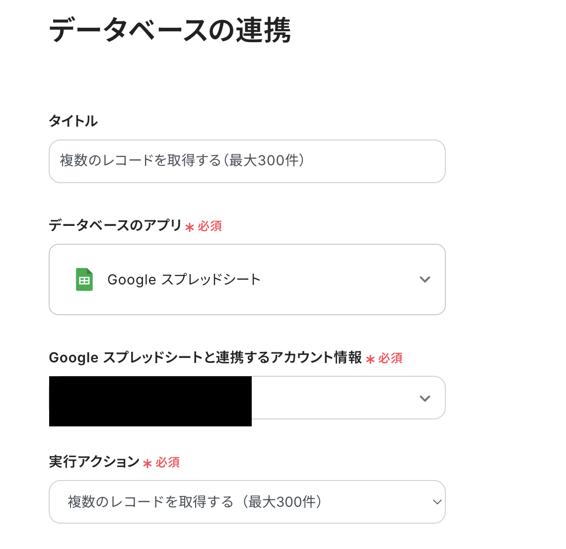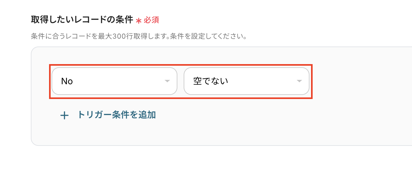 ここではGoogle スプレッドシートに登録されている複数のレコード情報を取得したいので、レコードに登録されている「No」が「空ではない」という設定をしています。