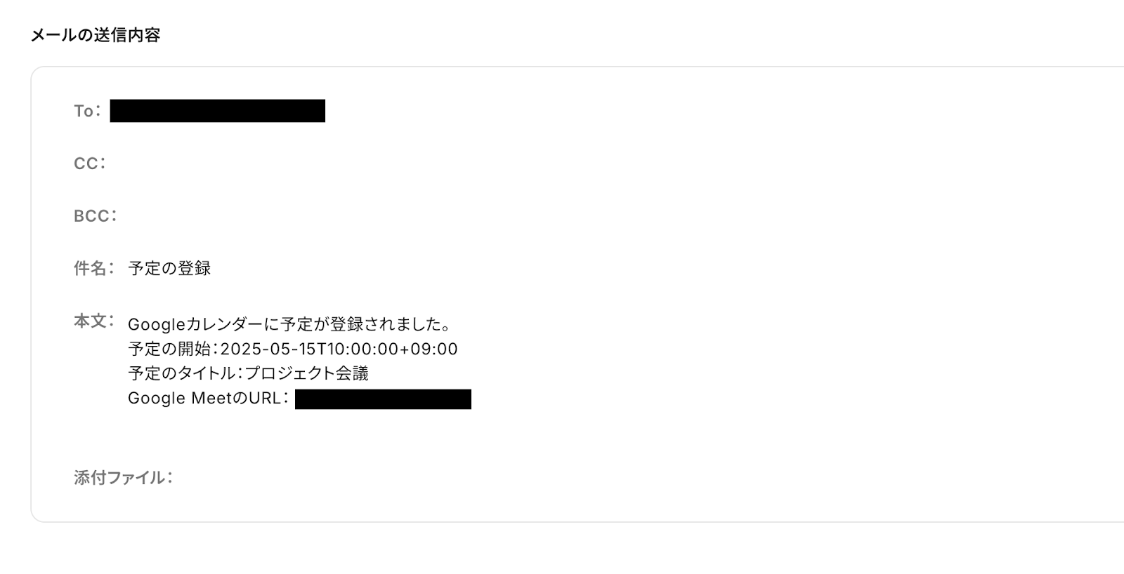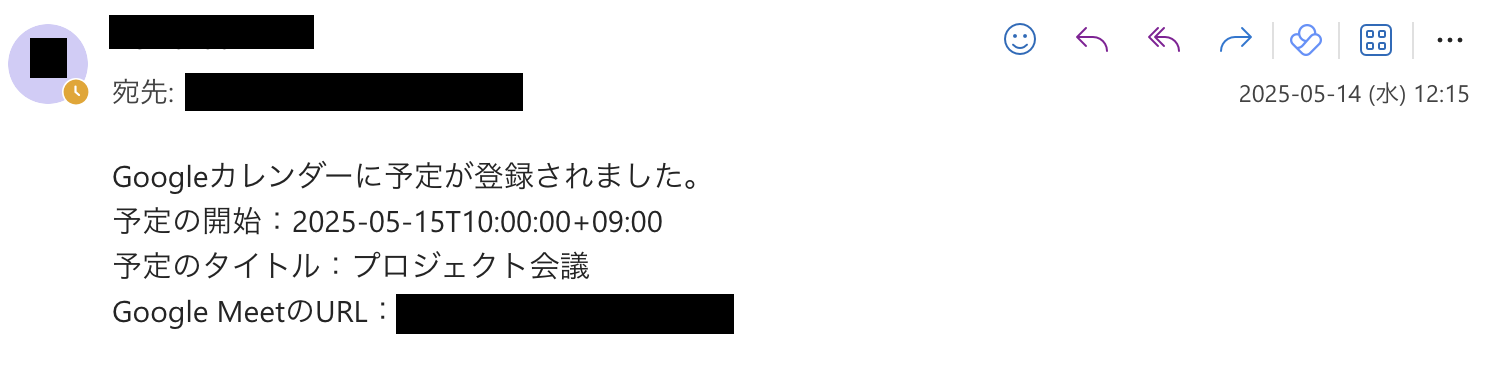 取得した値を使わずに予定のタイトルや日時を手入力した場合、同じ内容のメールが繰り返し送信されてしまうので注意してください。