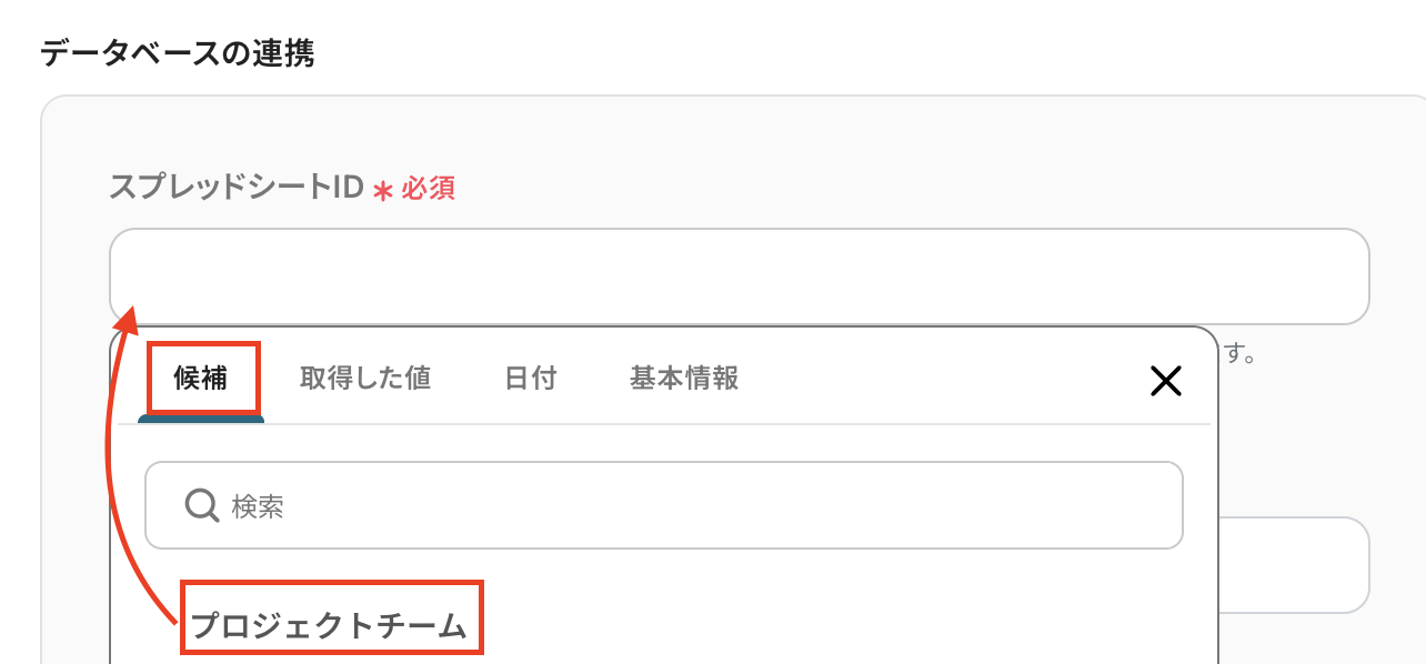 スプレッドシートID・タブ名:候補から、メールアドレスが保存されているデータベースを選択します。