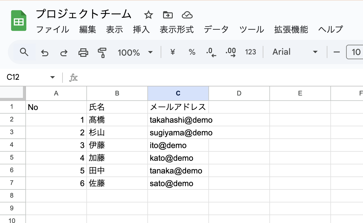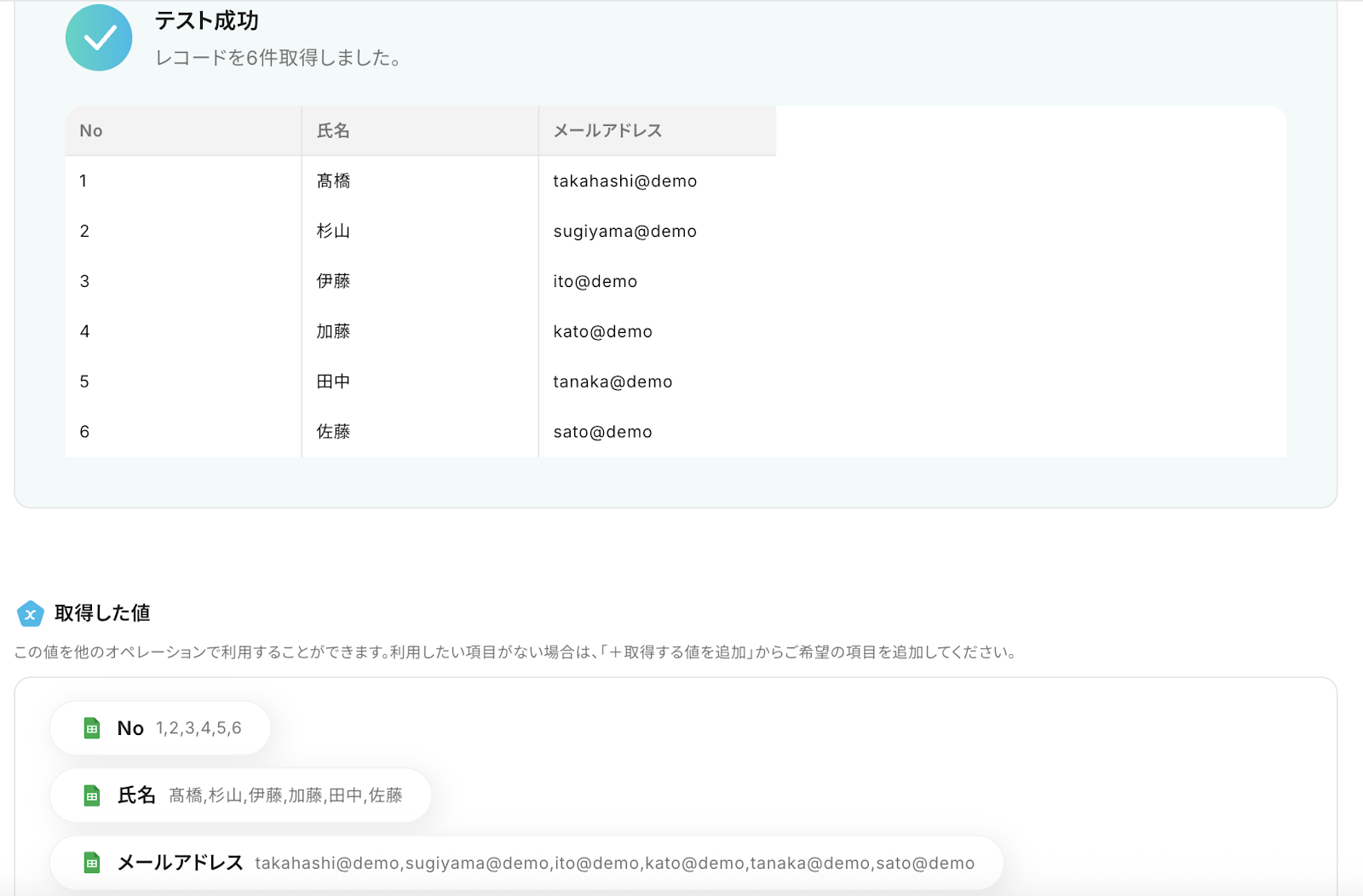 テストが成功すると、Google スプレッドシートに登録されている複数のレコード情報が取得できました。