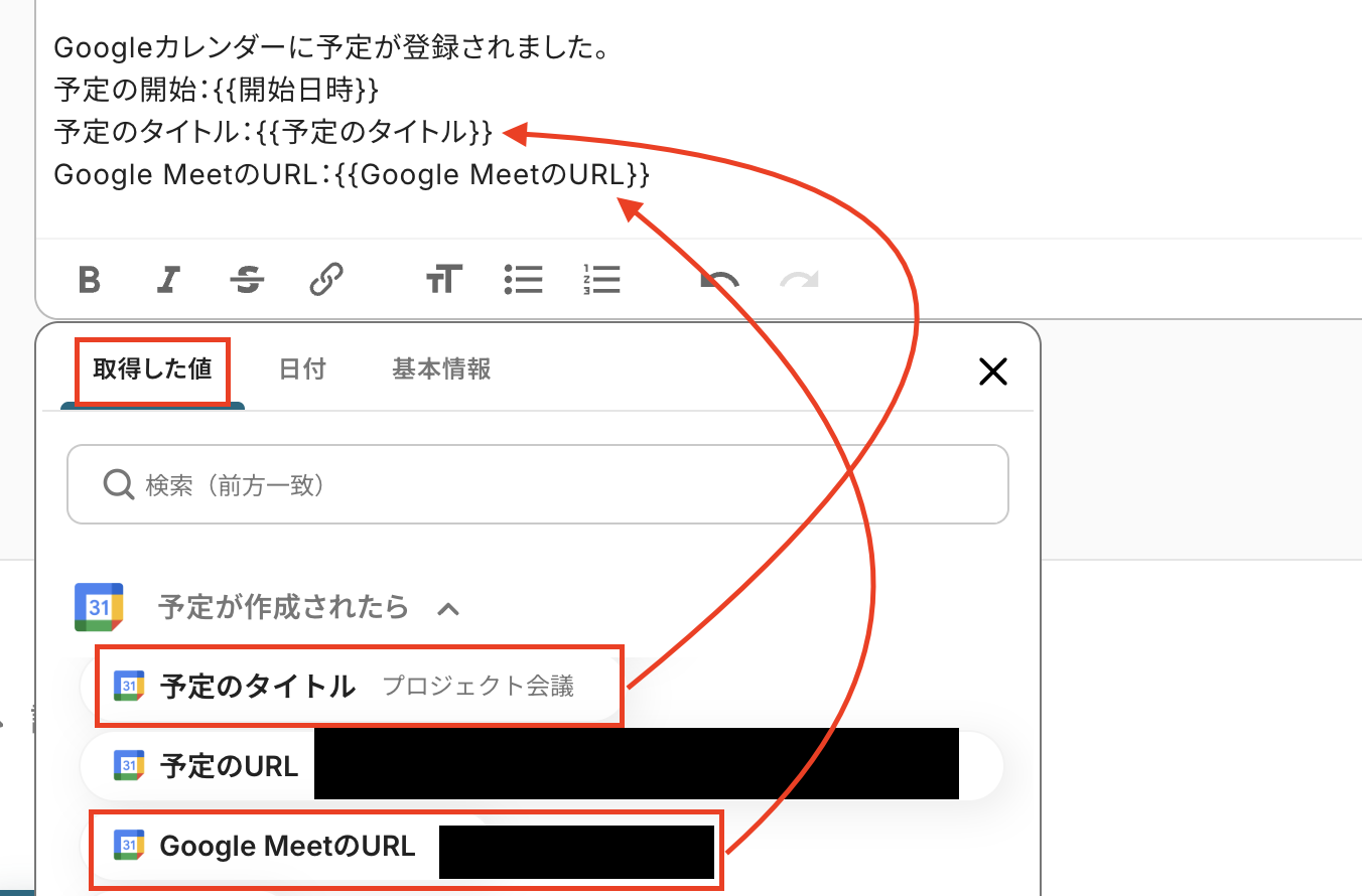本文はGoogleカレンダーの取得した値から選択し、メッセージを作成してみましょう。