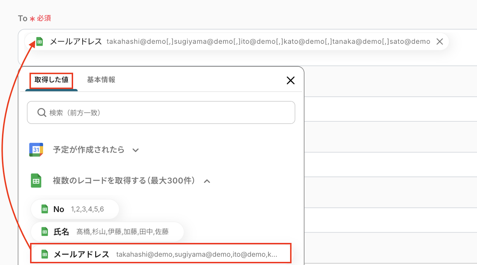 宛先はGoogle スプレッドシートの取得した値から「メールアドレス」を選択します。