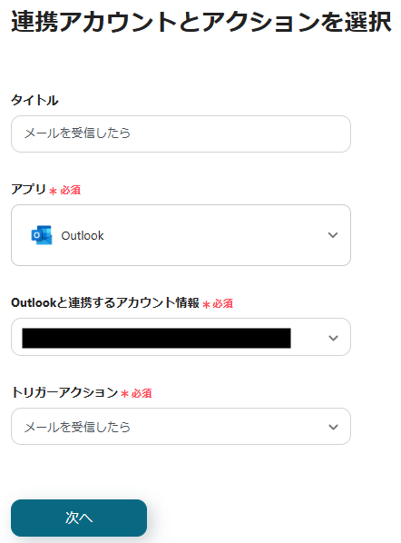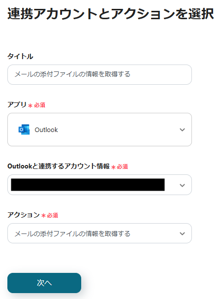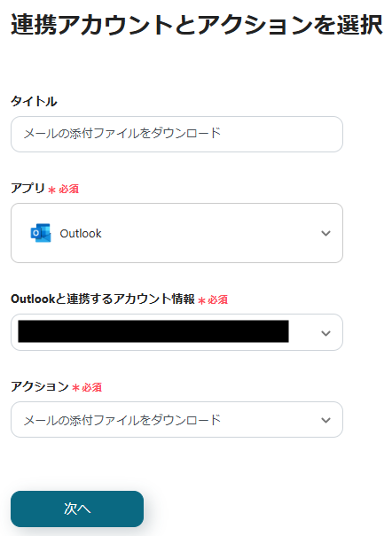 3.Outlookと連携するアカウントを確認し、「次へ」をクリックします。