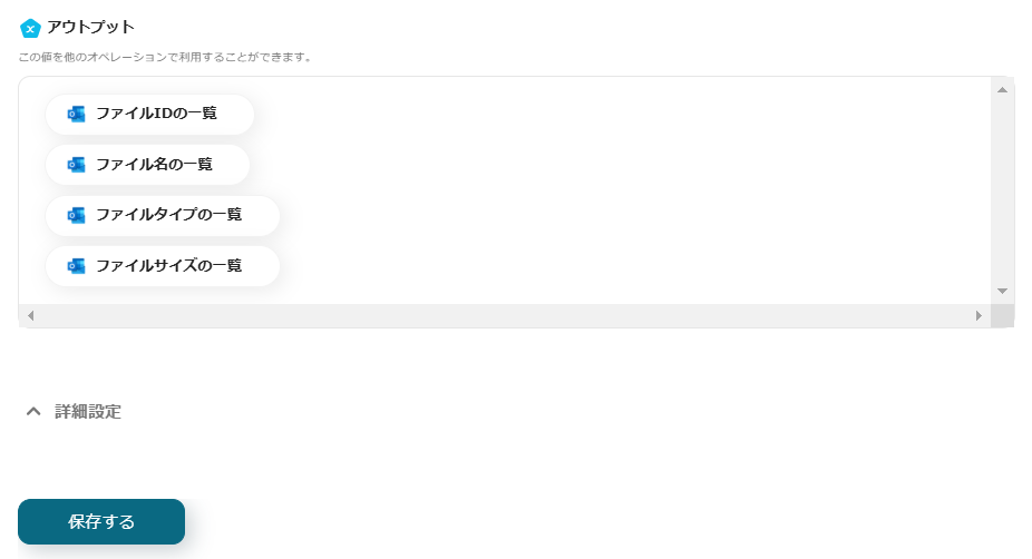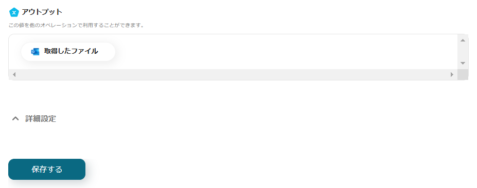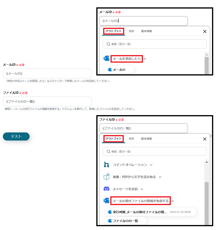 ※ファイルIDは、枠をクリックして表示されるアウトプットの「メールの添付ファイルの情報を取得する」から設定します。(値は二重括弧で表示されます)
