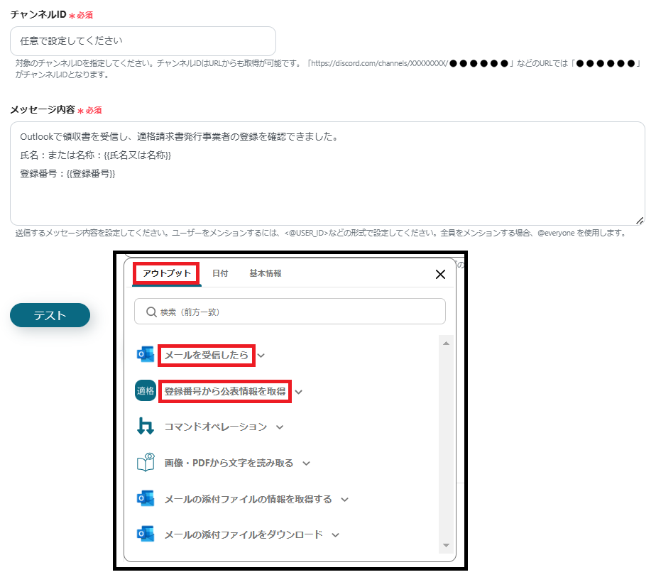 ※メッセージ内容には、定型文を直接入力できます。また、Outlookで受信したメールや登録番号に関する情報を反映させたい場合は、枠をクリックして表示されるアウトプットの「メールを受信したら」や「登録番号から公表情報を取得」から設定します。(値は二重括弧で表示されます)