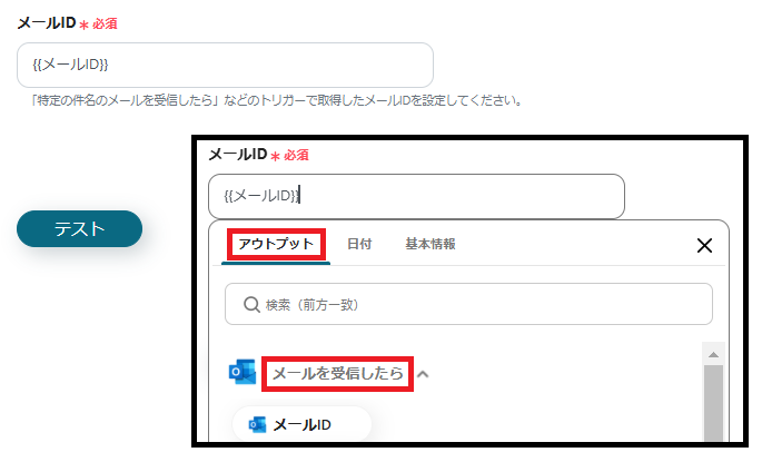 ※メールIDは、枠をクリックして表示されるアウトプットの「メールを受信したら」から設定します。(値は二重括弧で表示されます)