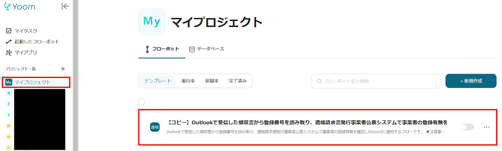 1.Yoom管理画面の「マイプロジェクト」を選択し、「【コピー】Outlookで受信した領収書から登録番号を読み取り、適格請求書発行事業者公表システムで事業者の登録有無を確認しDiscordに通知する」をクリックします。