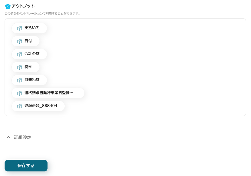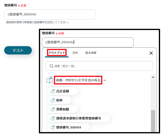 ※登録番号は、枠をクリックして表示されるアウトプットの「画像・PDFから文字を読み取る」から設定します。(値は二重括弧で表示されます)