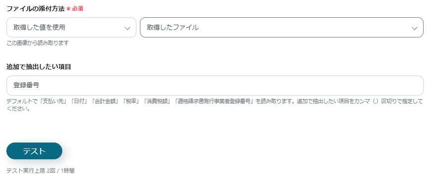 3.ファイルの添付方法と追加で抽出したい項目を設定し、テストを行います。