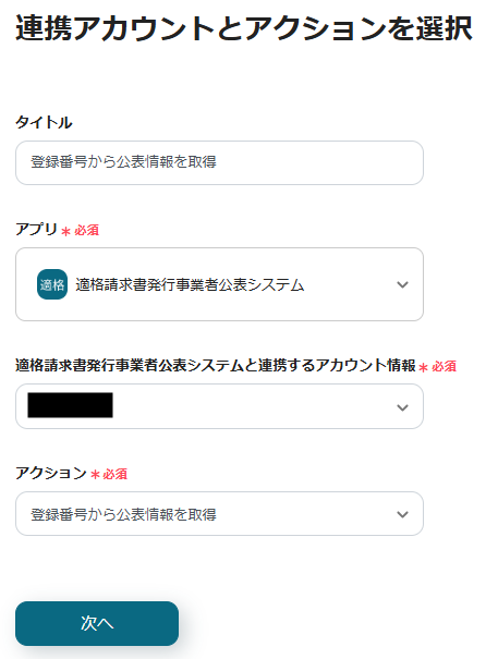 6.適格請求書発行事業者公表システムと連携するアカウントを確認し、「次へ」をクリックします。